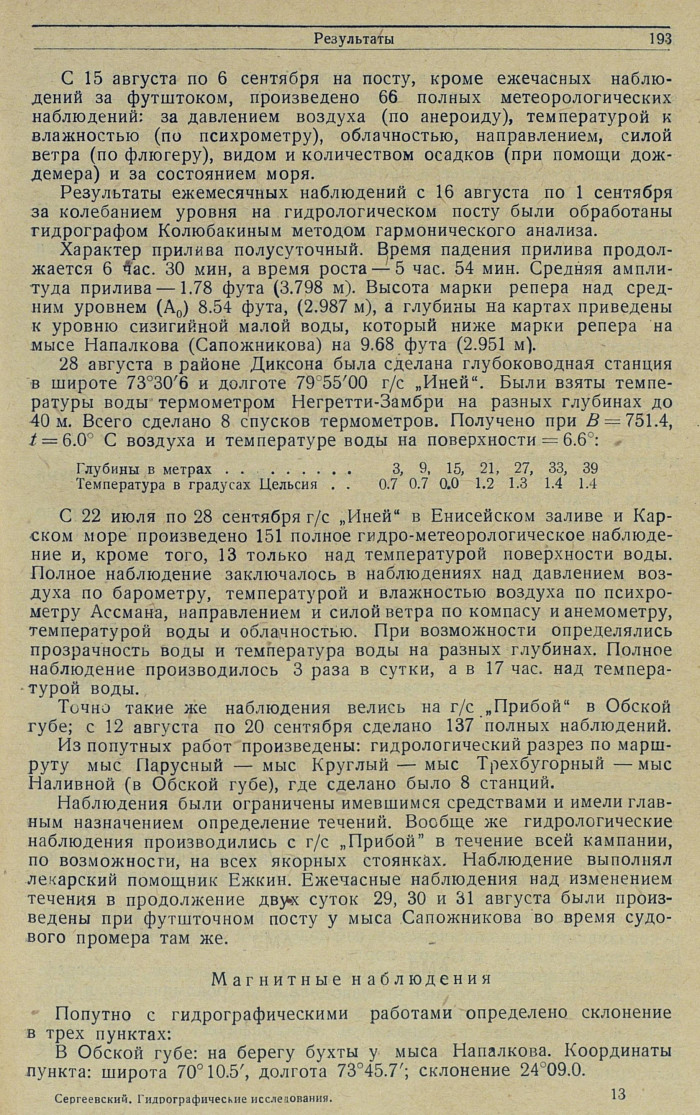 С 22 июля по 28 сентября г/с „Иней" в Енисейском заливе и Карском море произведено 151 полное гидро-метеорологическое наблюдение и, кроме того, 13 только над температурой поверхности воды. Полное наблюдение заключалось в наблюдениях над давлением воздуха по барометру, температурой и влажностью воздуха по психрометру Ассмана, направлением и силой ветра по компасу и анемометру, температурой воды и облачностью. При возможности определялись прозрачность воды и температура воды на разных глубинах. Полное наблюдение производилось 3 раза в сутки, а в 17 час. над температурой воды.