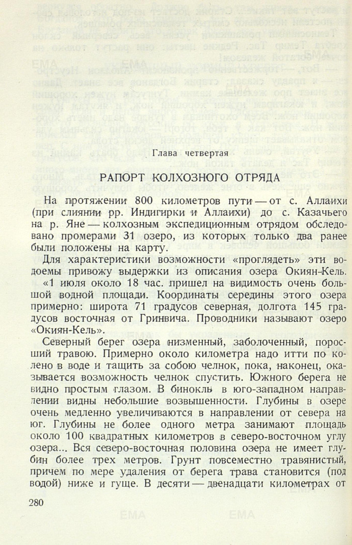 Глава четвертаяРАПОРТ КОЛХОЗНОГО ОТРЯДАНа протяжении 800 километров пути — от с. Аллаихи (при слиянии рр. Индигирки и Аллаихи) до с. Казачьего на р. Яне — колхозным экспедиционным отрядом обследовано промерами 31 озеро, из которых только два ранее были положены на карту.