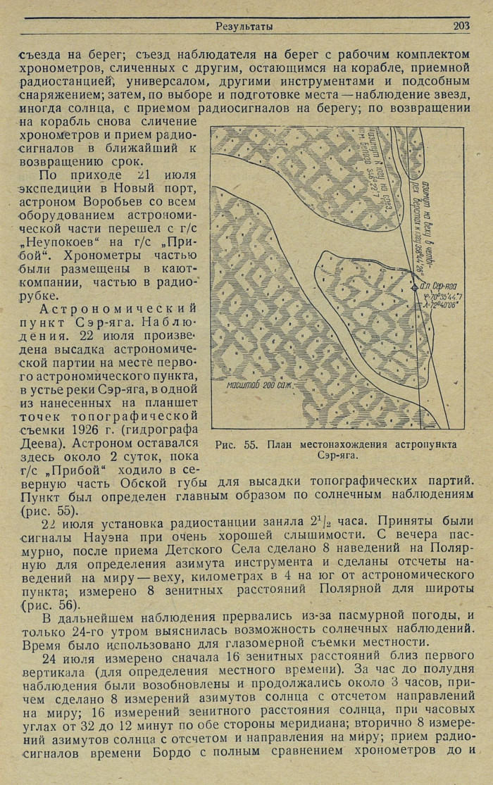 Астрономический пункт Сэр-яга. Наблюдения. 22 июля произведена высадка астрономической партии на месте первого астрономического пункта, в устье реки Сэр-яга, в одной из нанесенных на планшет точек топографической съемки 1926 г. (гидрографа Деева). Астроном оставался здесь около 2 суток, пока г/с „Прибой" ходило в северную часть Обской губы для высадки топографических партий. Пункт был определен главным образом по солнечным наблюдениям (рис. 55).