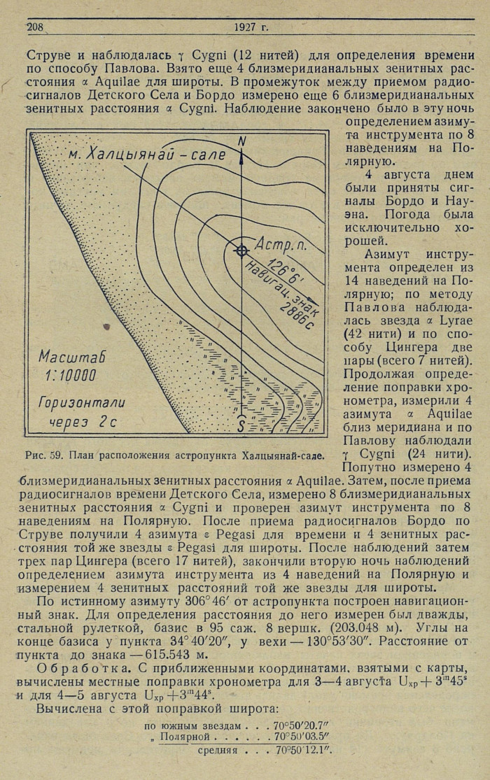 Астрономический пункт Халцыянай-сале. Высадка астронома Воробьева на место определения астропункта на мысе Халцыянай-сале произведена с г/с „Прибой" 3 августа в 10 час. утра. За две ночи было получено полное число наблюдений для определения пункта (рис. 59).