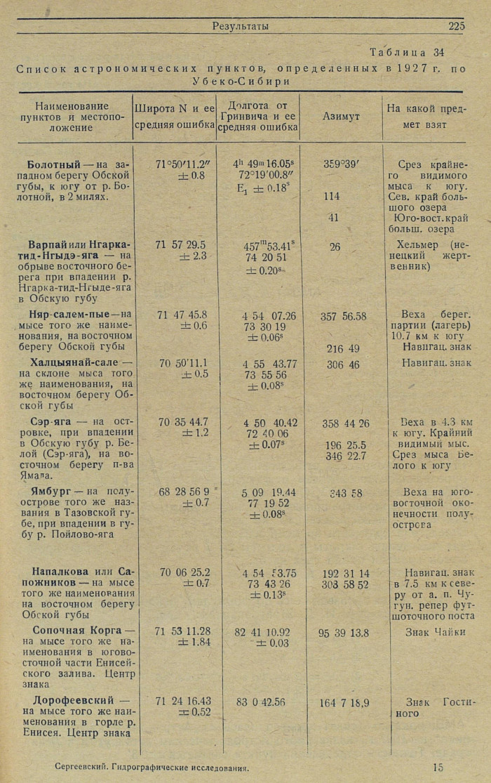 РезультатыАстрономические наблюденияАстрономические работы в Обской губе в основном имели целью обеспечить опорными пунктами съемку отчетного года и дать дополнительные контрольные пункты в районе съемки прошлого года, где астрономические пункты были расположены на значительном (до 60 — 80 миль) расстоянии.
