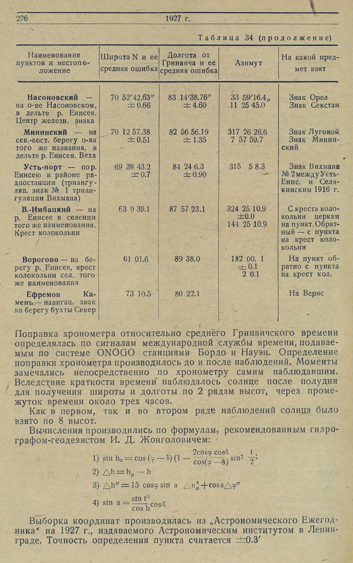 Выборка координат производилась из „Астрономического Ежегодника" на 1927 г., издаваемого Астрономическим институтом в Ленинграде. Точность определения пункта считается ± 0.3'