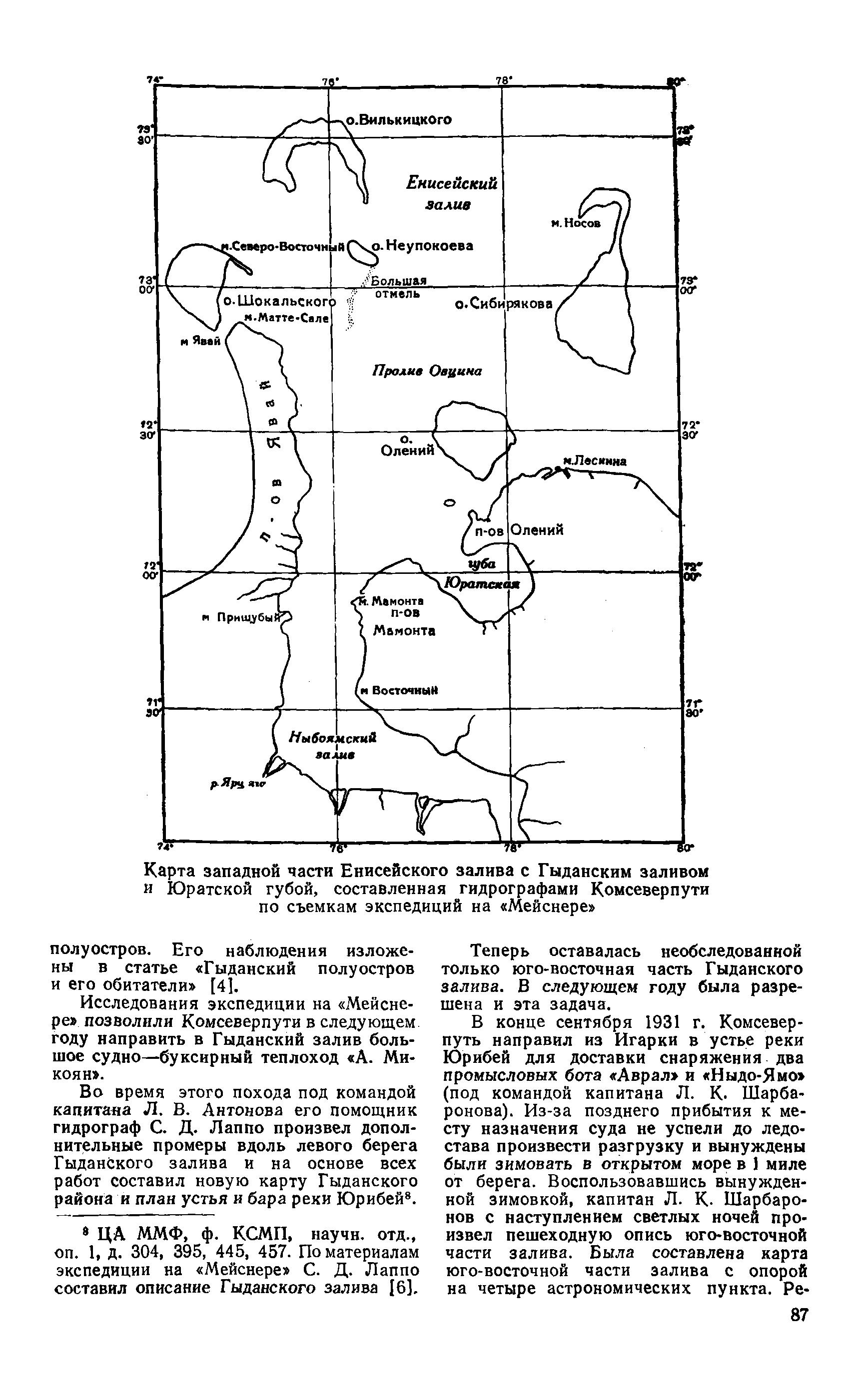 {8} ЦA ММФ, ф. КСМП, научн. отд., oп. 1, д. 304, 395, 445, 457. По материалам экспедиции на «Мейснере» С. Д. Лаппо составил описание Гыданского залива 16].