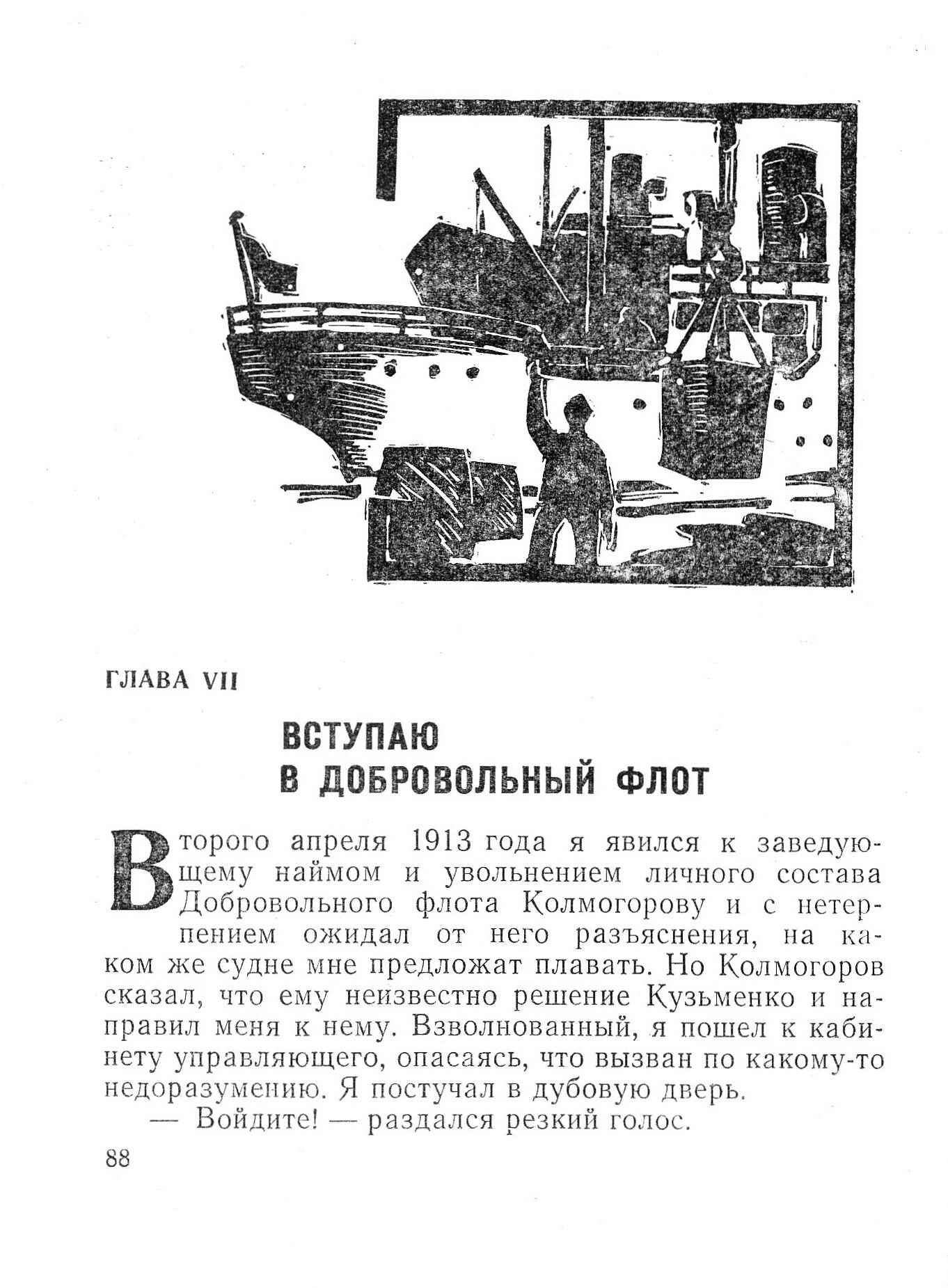Второго апреля 1913 года я явился к заведующему наймом и увольнением личного состава Добровольного флота Колмогорову и с нетерпением ожидал от него разъяснения, на каком же судне мне предложат плавать. Но Колмогоров сказал, что ему неизвестно решение Кузьменко и направил меня к нему. Взволнованный, я пошел к кабинету управляющего, опасаясь, что вызван по какому-то недоразумению. Я постучал в дубовую дверь.
