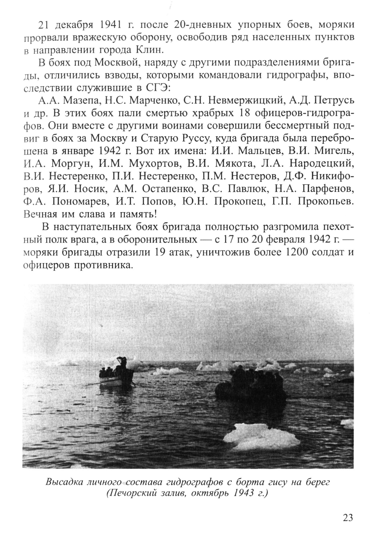 В боях под Москвой, наряду с другими подразделениями бригады, отличились взводы, которыми командовали гидрографы, впоследствии служившие в СГЭ: А. А. Мазепа, Н.С. Марченко, С.Н. Невмержицкий, А.Д. Петрусь и др. В этих боях пали смертью храбрых 18 офицеров-гидрографов. Они вместе с другими воинами совершили бессмертный подвиг в боях за Москву и Старую Руссу, куда бригада была переброшена в январе 1942 г. Вот их имена: И.И. Мальцев, В.И. Мигель, И.А. Моргун, И.М. Мухортов, В.И. Мякота, Л.A. Народецкий, В.И. Нестеренко, П.И. Нестеренко, П.М. Нестеров, Д.Ф. Никифоров, Я.И. Носик, А.М. Остапенко, B.C. Павлюк, Н.А. Парфенов, Ф.А. Пономарев, И.Т. Попов, Ю.Н. Прокопец, Г.П. Прокопьев.