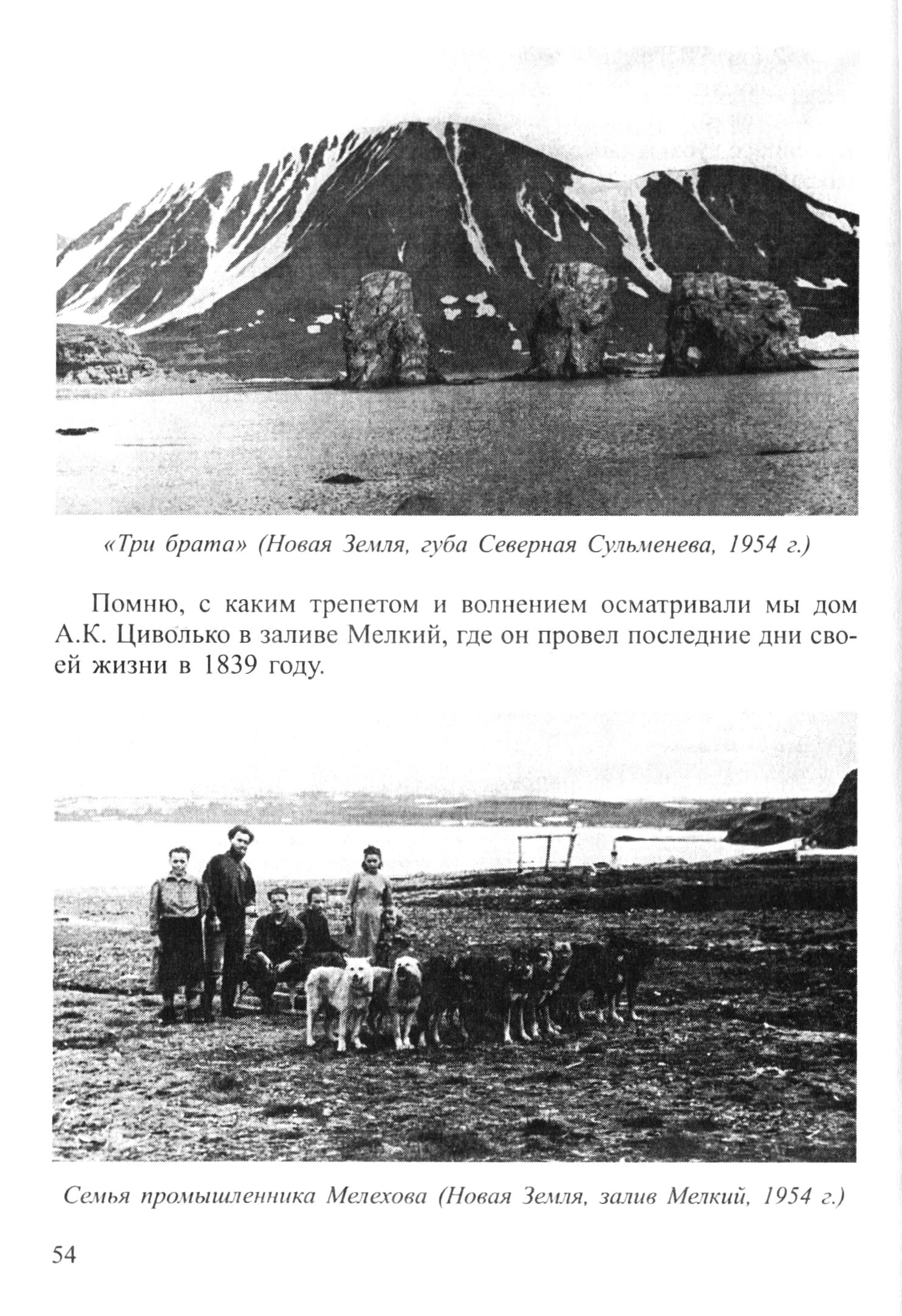 «Три брата» (Новая Земля, губа Северная Сульменева, 1954 г.)Помню, с каким трепетом и волнением осматривали мы дом А. К. Циволько в заливе Мелкий, где он провел последние дни своей жизни в 1839 году.