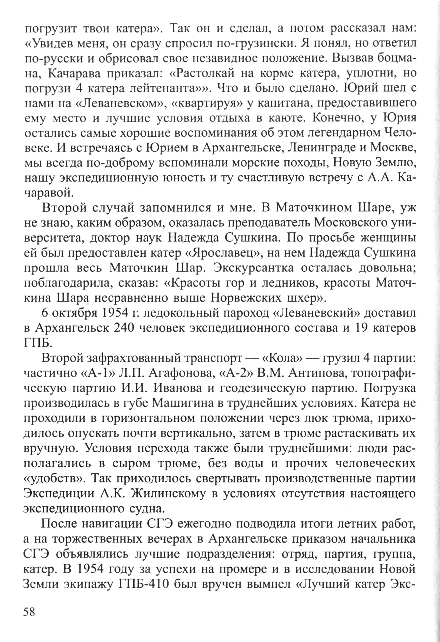 погрузит твои катера». Так он и сделал, а потом рассказал нам: «Увидев меня, он сразу спросил по-грузински. Я понял, но ответил по-русски и обрисовал свое незавидное положение. Вызвав боцмана, Качарава приказал: «Растолкай на корме катера, уплотни, но погрузи 4 катера лейтенанта»». Что и было сделано. Юрий шел с нами на «Леваневском», «квартируя» у капитана, предоставившего ему место и лучшие условия отдыха в каюте. Конечно, у Юрия остались самые хорошие воспоминания об этом легендарном Человеке. И встречаясь с Юрием в Архангельске, Ленинграде и Москве, мы всегда по-доброму вспоминали морские походы, Новую Землю, нашу экспедиционную юность и ту счастливую встречу с А. А. Качаравой.