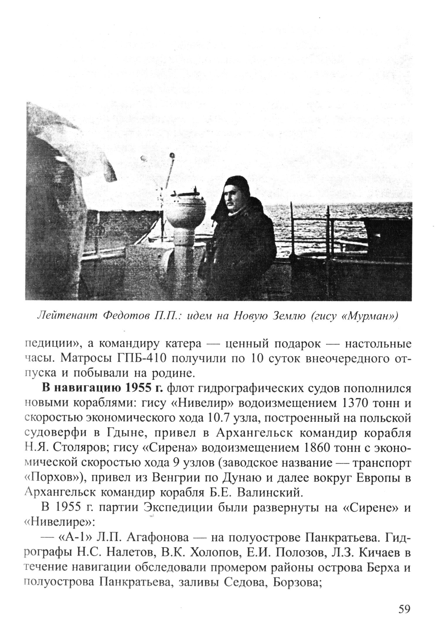 В навигацию 1955 г. флот гидрографических судов пополнился новыми кораблями: гису «Нивелир» водоизмещением 1370 тонн и скоростью экономического хода 10. 7 узла, построенный на польской судоверфи в Гдыне, привел в Архангельск командир корабля Н. Я. Столяров; гису «Сирена» водоизмещением 1860 тонн с экономической скоростью хода 9 узлов (заводское название — транспорт «Порхов»), привел из Венгрии по Дунаю и далее вокруг Европы в Архангельск командир корабля Б. Е. Валинский.