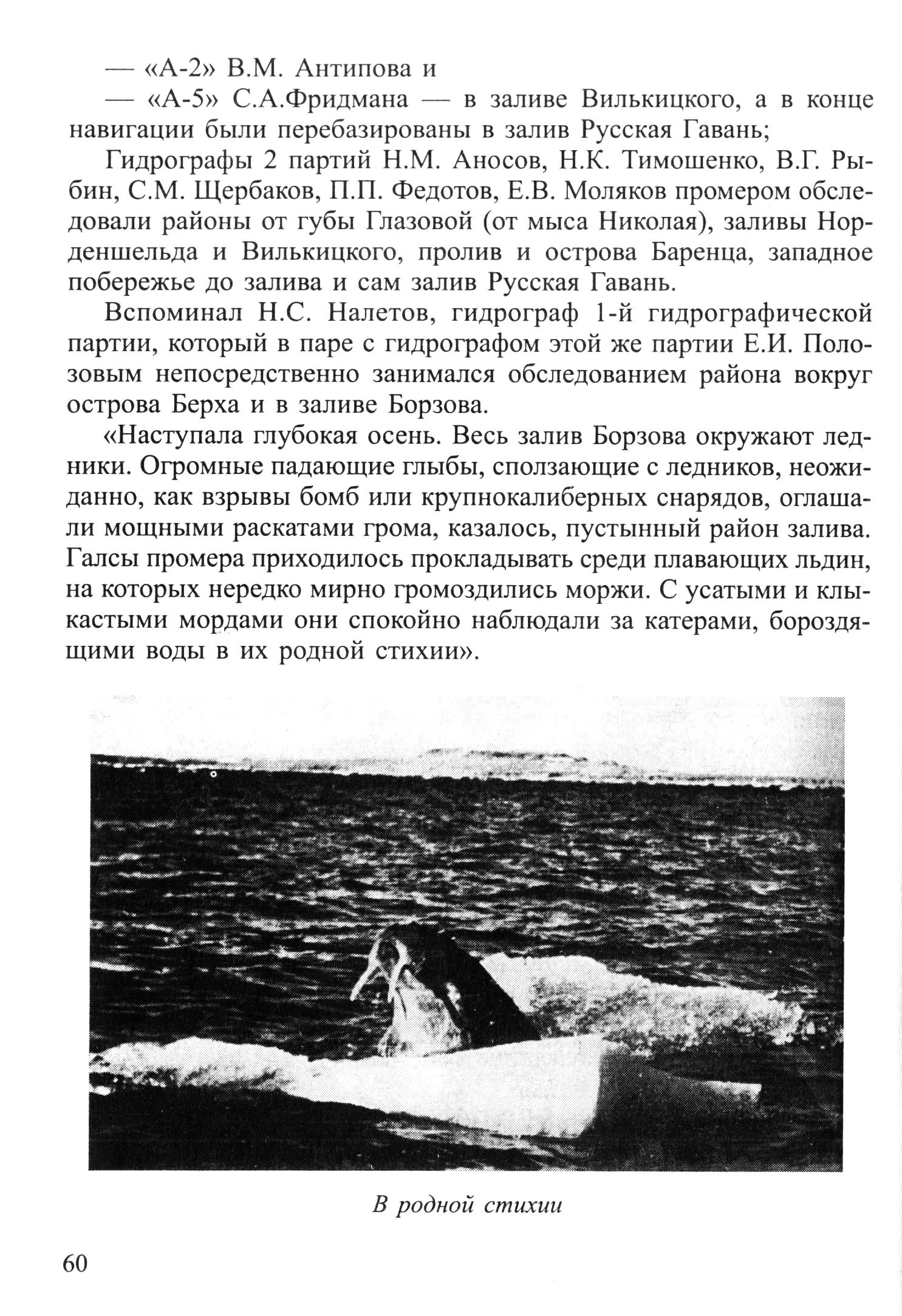 Галсы промера приходилось прокладывать среди плавающих льдин, на которых нередко мирно громоздились моржи. С усатыми и клыкастыми мордами они спокойно наблюдали за катерами, бороздящими воды в их родной стихии».