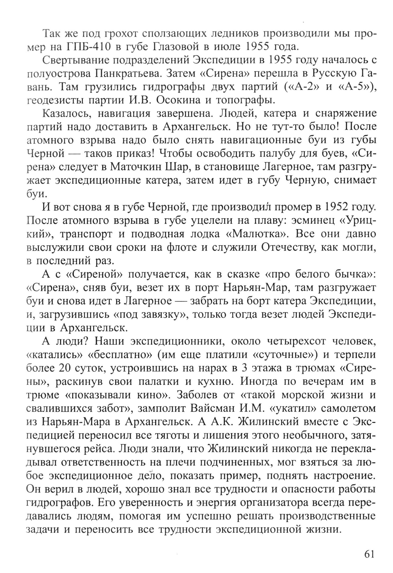 А люди? Наши экспедиционники, около четырехсот человек, «катались» «бесплатно» (им еще платили «суточные») и терпели более 20 суток, устроившись на нарах в 3 этажа в трюмах «Сирены», раскинув свои палатки и кухню. Иногда по вечерам им в трюме «показывали кино». Заболев от «такой морской жизни и свалившихся забот», замполит Вайсман И. М. «укатил» самолетом из Нарьян-Мара в Архангельск. А А. К. Жилинский вместе с Экспедицией переносил все тяготы и лишения этого необычного, затянувшегося рейса. Люди знали, что Жилинский никогда не перекладывал ответственность на плечи подчиненных, мог взяться за любое экспедиционное дело, показать пример, поднять настроение. Он верил в людей, хорошо знал все трудности и опасности работы гидрографов. Его уверенность и энергия организатора всегда передавались людям, помогая им успешно решать производственные задачи и переносить все трудности экспедиционной жизни.