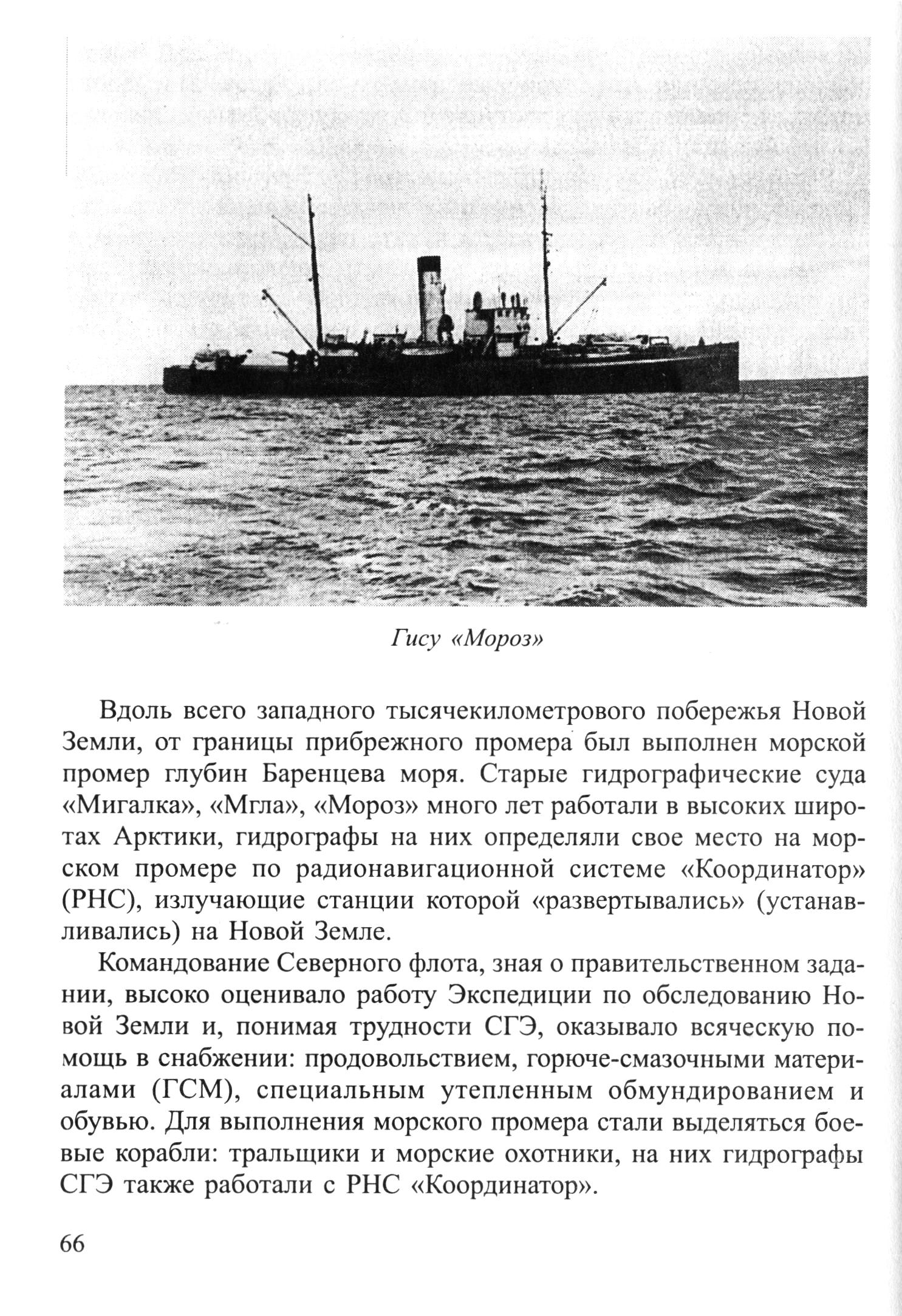 Гису «Мороз»Вдоль всего западного тысячекилометрового побережья Новой Земли, от границы прибрежного промера был выполнен морской промер глубин Баренцева моря. Старые гидрографические суда «Мигалка», «Мгла», «Мороз» много лет работали в высоких широтах Арктики, гидрографы на них определяли свое место на морском промере по радионавигационной системе «Координатор» (РНС), излучающие станции которой «развертывались» (устанавливались) на Новой Земле.