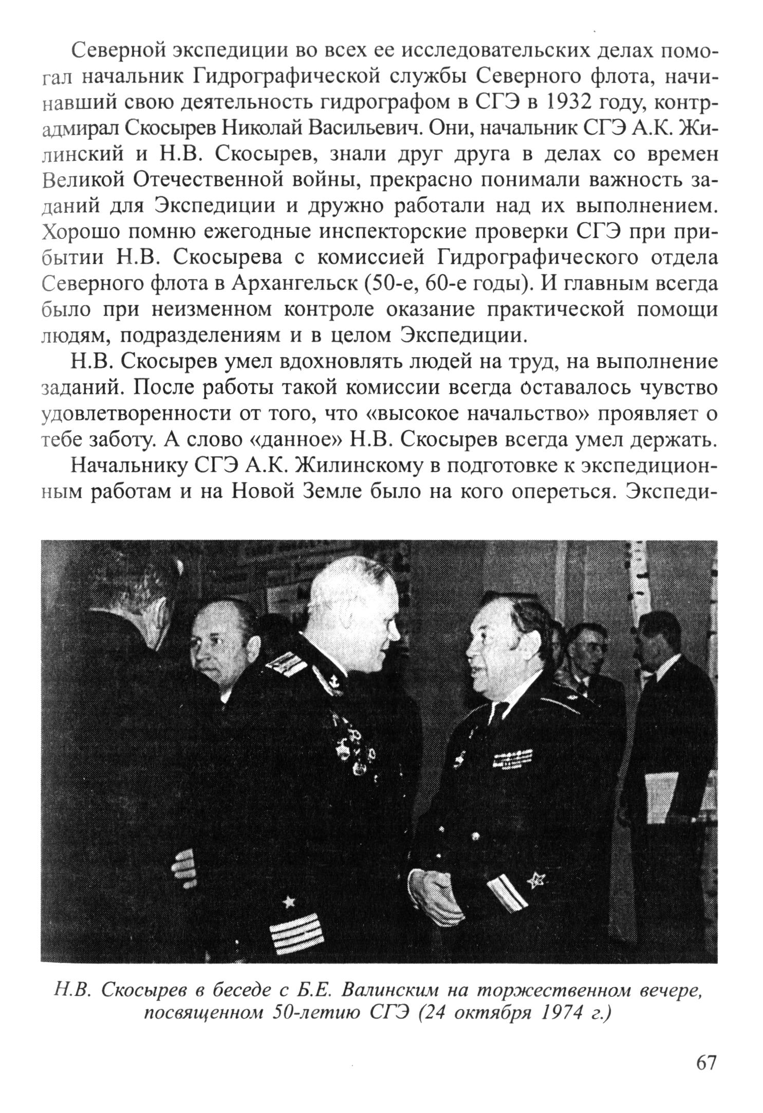 Северной экспедиции во всех ее исследовательских делах помогал начальник Гидрографической службы Северного флота, начинавший свою деятельность гидрографом в СГЭ в 1932 году, контр-адмирал Скосырев Николай Васильевич. Они, начальник СГЭ А. К. Жилинский и Н. В. Скосырев, знали друг друга в делах со времен Великой Отечественной войны, прекрасно понимали важность заданий для Экспедиции и дружно работали над их выполнением. Хорошо помню ежегодные инспекторские проверки СГЭ при прибытии Н. В. Скосырева с комиссией Гидрографического отдела Северного флота в Архангельск (50-е, 60-е годы). И главным всегда было при неизменном контроле оказание практической помощи людям, подразделениям и в целом Экспедиции.