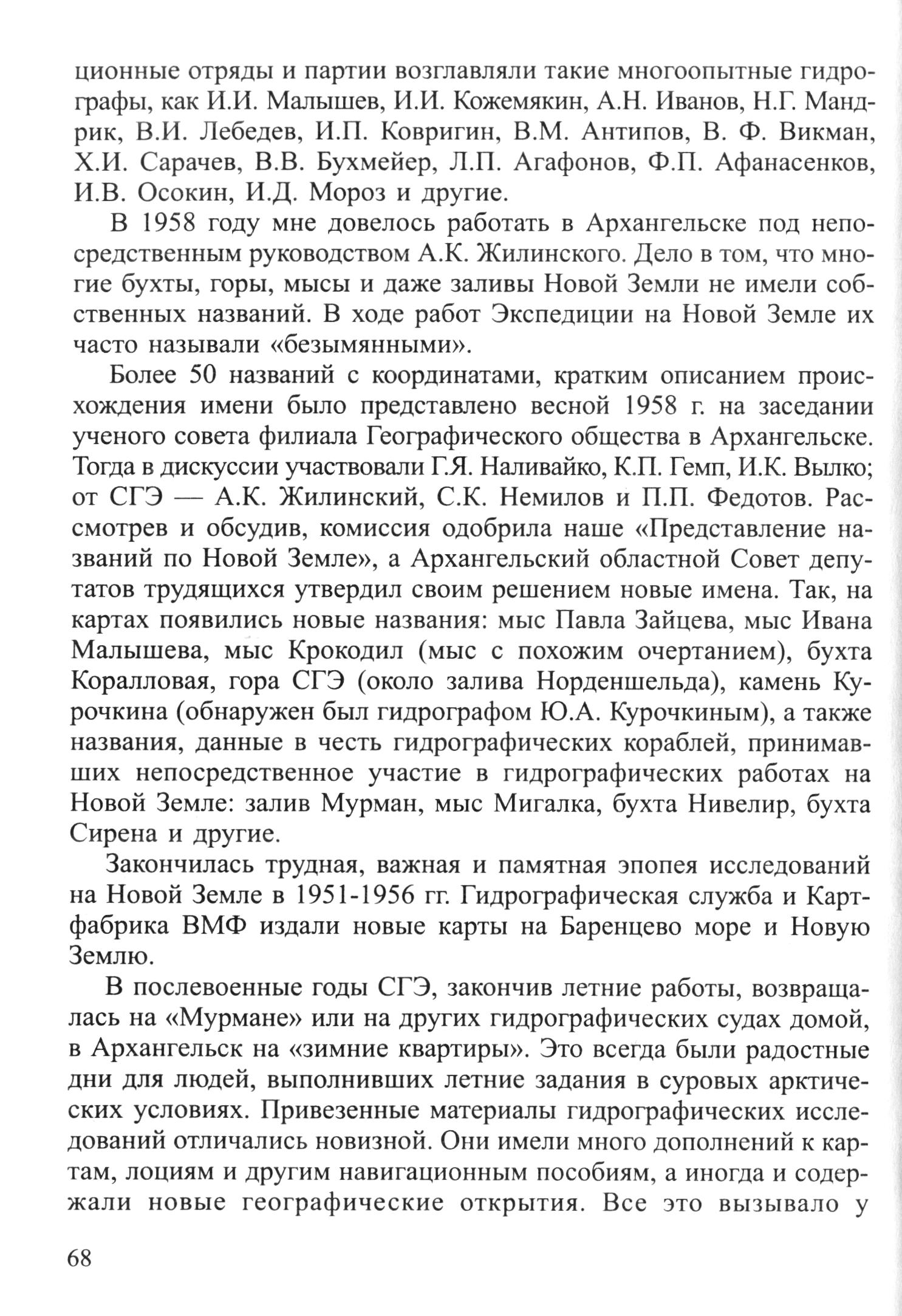 Тогда в дискуссии участвовали Г. Я. Наливайко, К. П. Гемп, И. К. Вылко; от СГЭ — А. К. Жилинский, С. К. Немилов и П. П. Федотов. Рассмотрев и обсудив, комиссия одобрила наше «Представление названий по Новой Земле», а Архангельский областной Совет депутатов трудящихся утвердил своим решением новые имена. Так, на картах появились новые названия: мыс Павла Зайцева, мыс Ивана Малышева, мыс Крокодил (мыс с похожим очертанием), бухта Коралловая, гора СГЭ (около залива Норденшельда), камень Курочкина (обнаружен был гидрографом Ю. А. Курочкиным), а также названия, данные в честь гидрографических кораблей, принимавших непосредственное участие в гидрографических работах на Новой Земле: залив Мурман, мыс Мигалка, бухта Нивелир, бухта Сирена и другие.