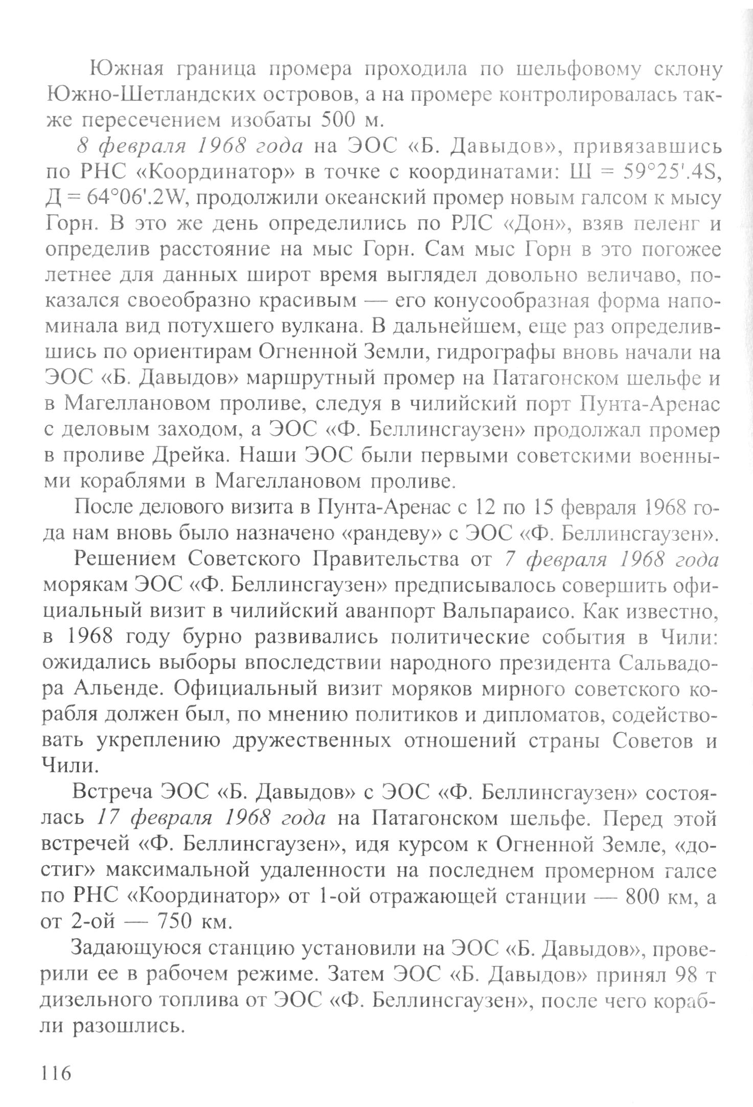 8 февраля 1968 года на ЭОС «Б. Давыдов», привязавшись по РНС «Координатор» в точке с координатами: Ш = 59°25'.4S, Д = 64°06'.2W, продолжили океанский промер новым галсом к мысу Горн. В это же день определились по РЛС «Дон», взяв пеленг и определив расстояние на мыс Горн. Сам мыс Горн в это погожее летнее для данных широт время выглядел довольно величаво, показался своеобразно красивым — его конусообразная форма напоминала вид потухшего вулкана. В дальнейшем, еще раз определившись по ориентирам Огненной Земли, гидрографы вновь начали на ЭОС «Б. Давыдов» маршрутный промер на Патагонском шельфе и в Магеллановом проливе, следуя в чилийский порт Пунта-Аренас с деловым заходом, а ЭОС «Ф. Беллинсгаузен» продолжал промер в проливе Дрейка. Наши ЭОС были первыми советскими военными кораблями в Магеллановом проливе.