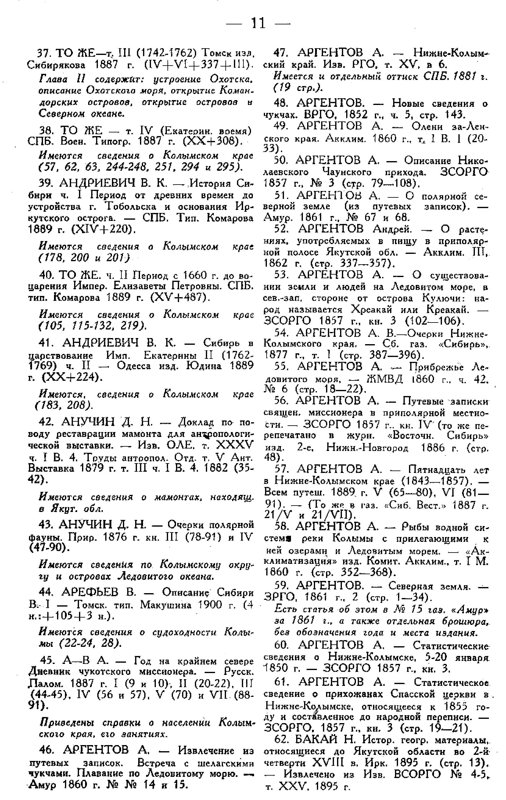 57. АРГЕНТОВ А. — Пятнадцать лет в Нижне-Колымском крае (1843—1857). — Всем путеш. 1889 г. V (65—80), VI (81—91). — (То же в газ. «Сиб. Вест.» 1887 г. 21/V и 21/VII).
