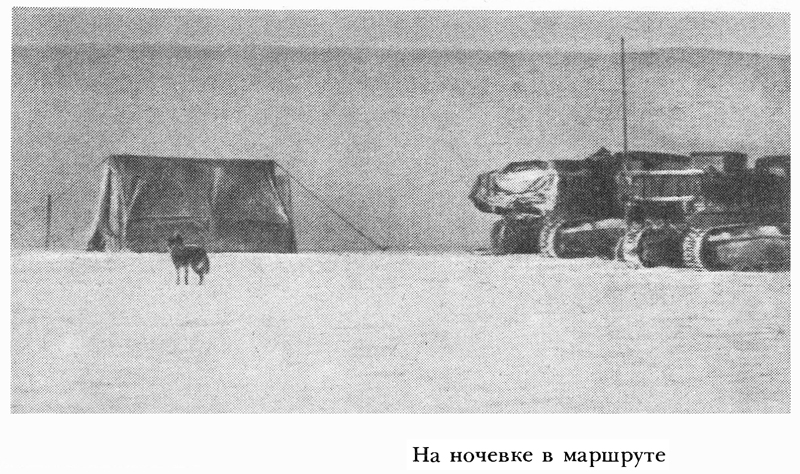 На стоянке машины мы поставили рядом, радиаторами на юго-запад, навстречу господствующим ветрам, о направлении которых свидетельствовали многочисленные заструги. Воду сразу же слили в бидоны и поместили в термос, а радиаторы и перед машин сверху и снизу закрыли меховыми капотами. Никто, кроме меня, в полярных маршрутах не бывал, а потому разбивка лагеря заняла довольно много времени. Приходилось учить, как выбирать место для палатки, как ее ставить, как ориентировать, крепить, чтобы не занесло и не порвало в случае неожиданно налетевшей бури.