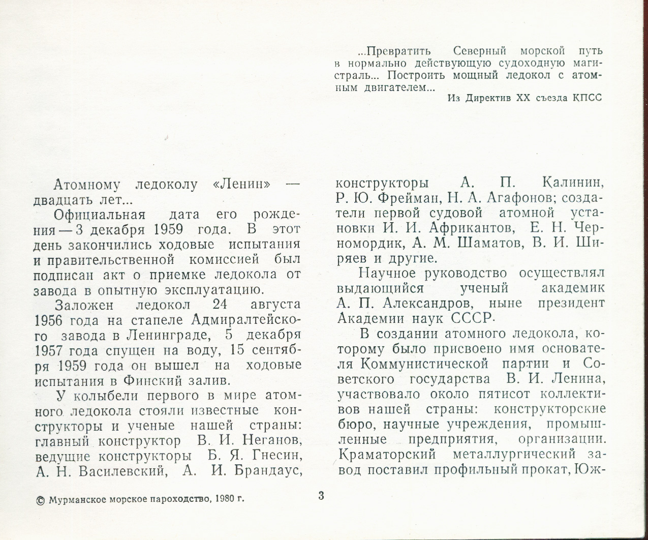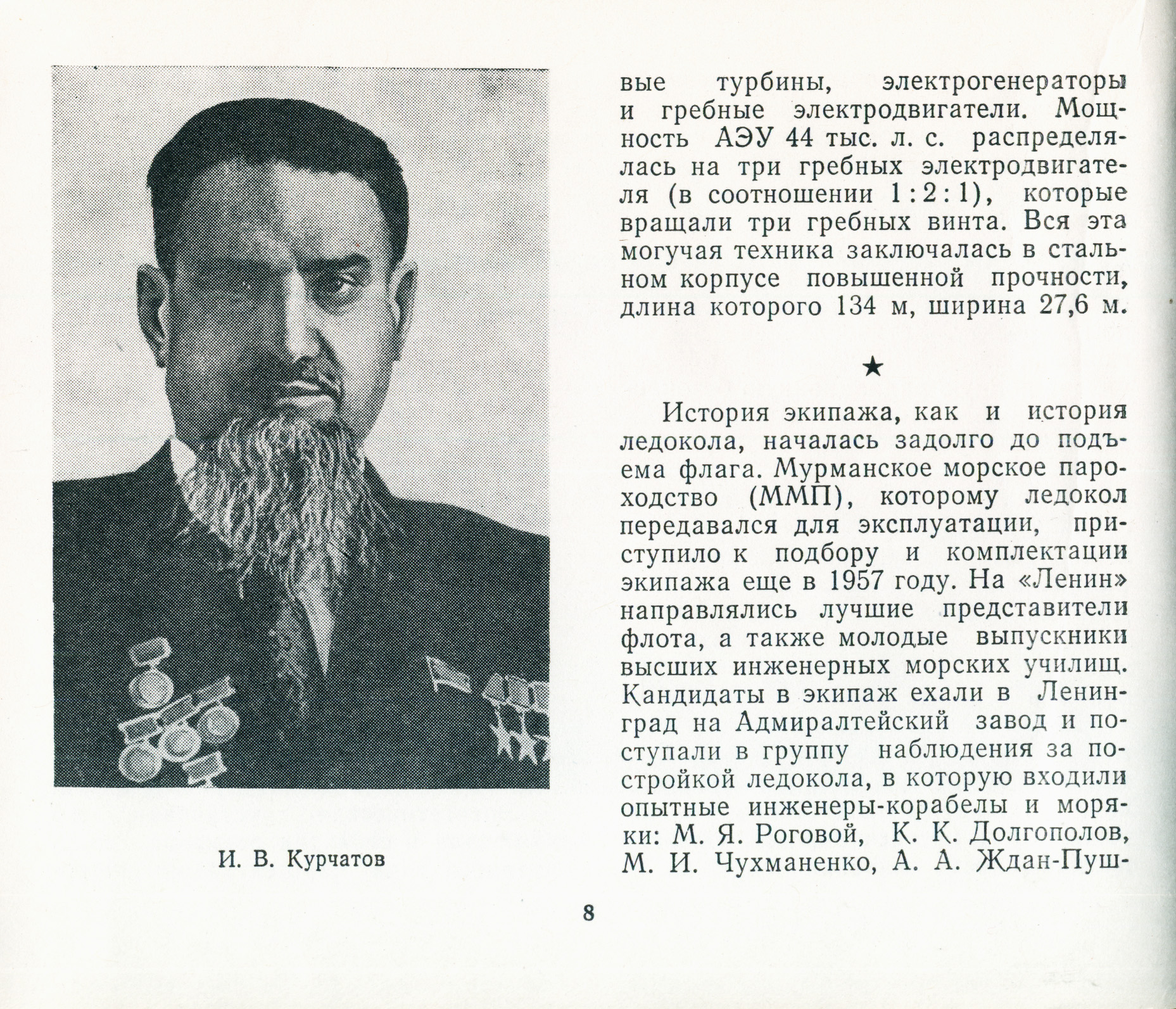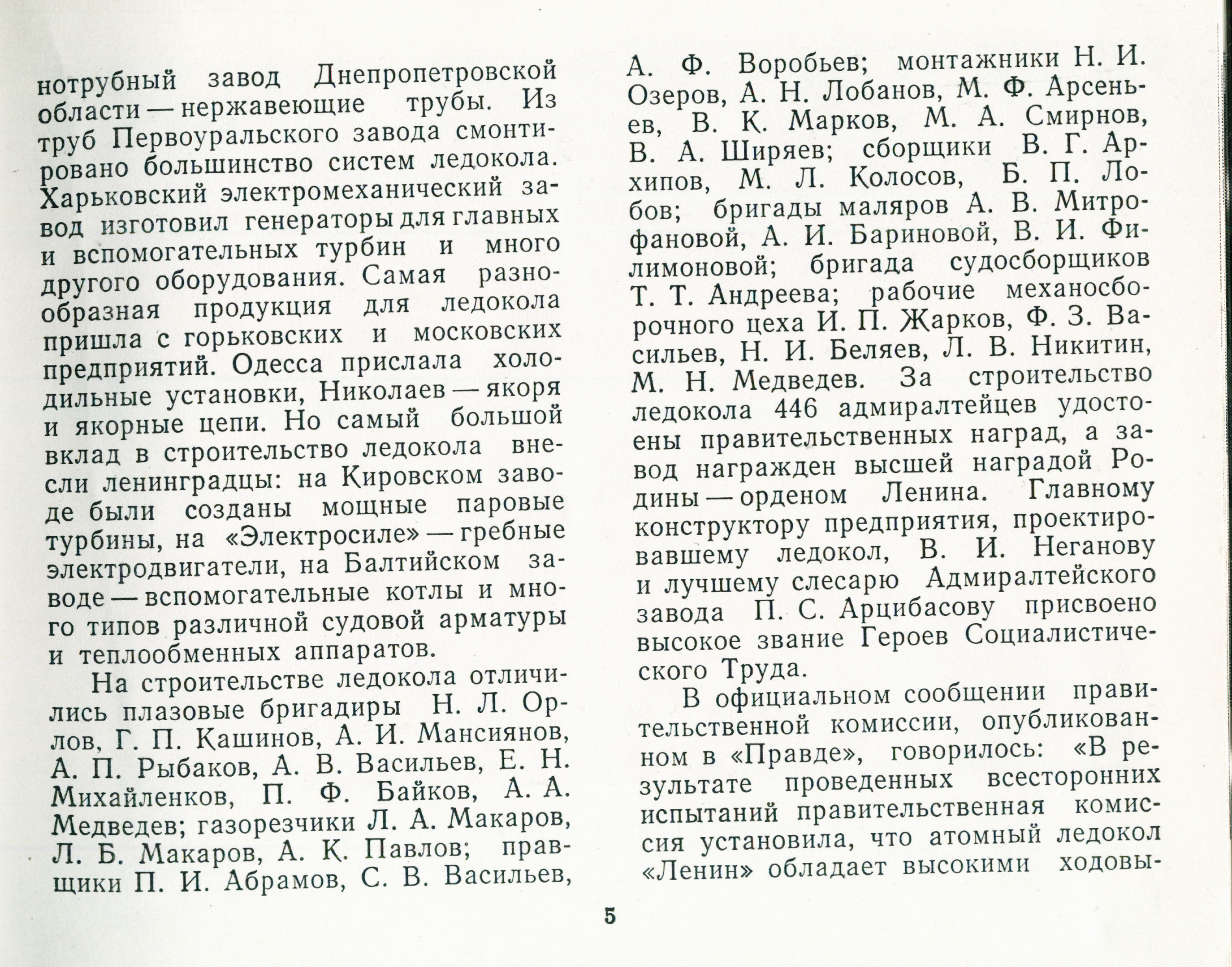 Научное руководство осуществлял выдающийся ученый академик А. П. Александров, ныне президент Академии наук СССР-В создании атомного ледокола, которому было присвоено имя основателя Коммунистической партии и Советского государства В. И. Ленина, участвовало около пятисот коллективов нашей страны: конструкторские бюро, научные учреждения, промышленные предприятия, организации. Краматорский металлургический завод поставил профильный прокат, Южнотрубный завод Днепропетровской области - нержавеющие трубы. Из труб Первоуральском завода смонтировано большинство систем ледокола. Харьковский электромеханический завод изготовил генераторы для главных и вспомогательных турбин и много другого оборудования. Самая разнообразная продукция для ледокола пришла с горьковских и московских предприятий. Одесса прислала холодильные установки, Николаев - якоря и якорные цепи. Но самый большой вклад в строительство ледокола внесли ленинградцы: на Кировском заводе были созданы мощные паровые турбины, на «Электросиле» - гребные электродвигатели, на Балтийском заводе-вспомогательные котлы и много типов различной судовой арматуры и теплообменных аппаратов.