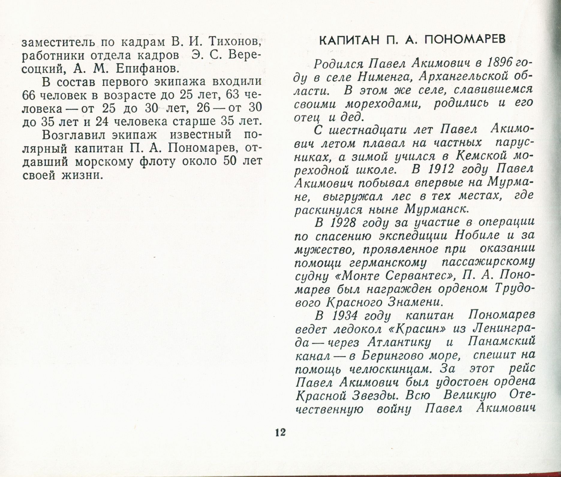 Возглавил экипаж известный полярный капитан П. А. Пономарев, отдавший морскому флоту около 50 лет своей жизни.