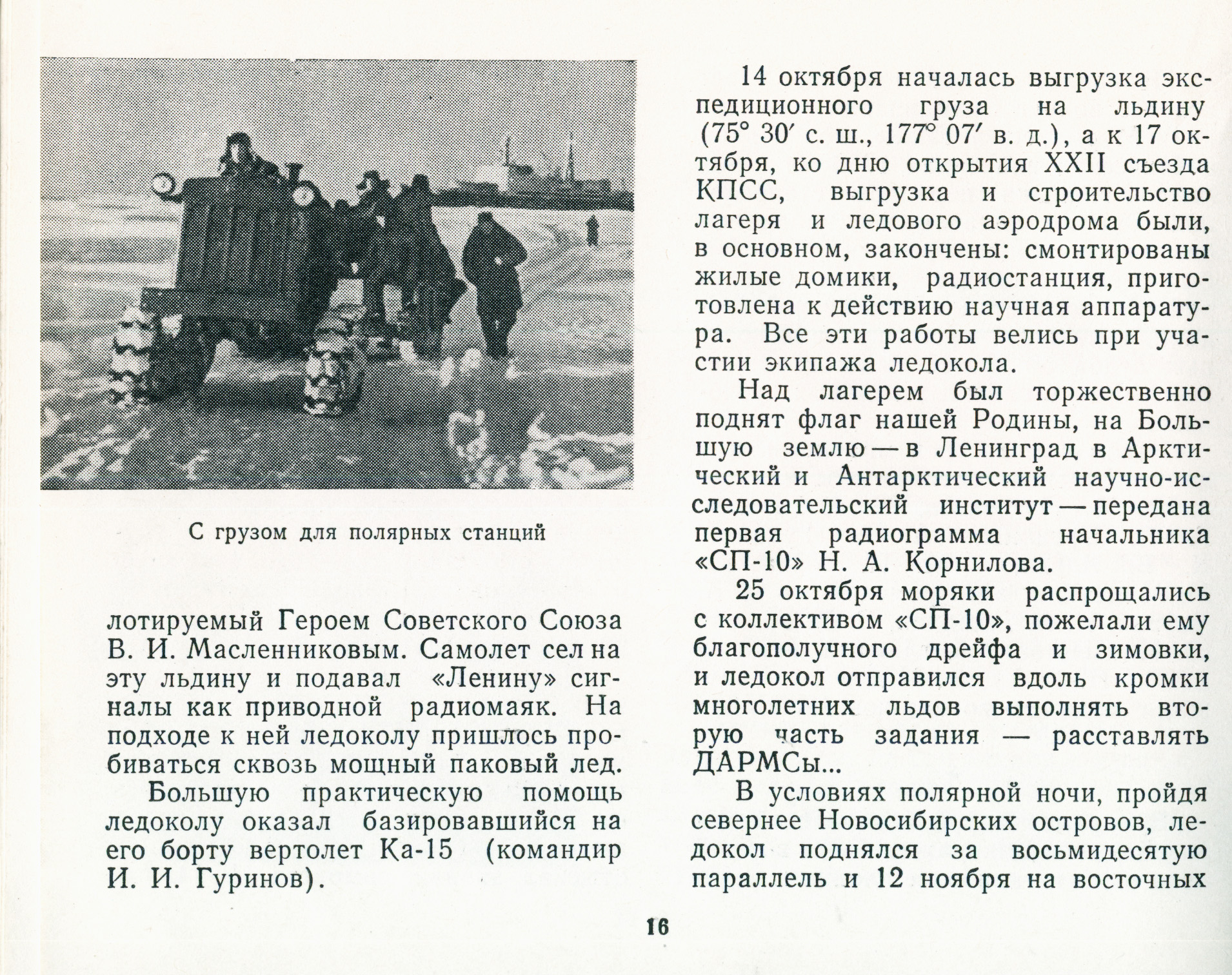 Большую практическую помощь ледоколу оказал базировавшийся на его борту вертолет Ка-15 (командир И. И. Гуринов).14 октября началась выгрузка экспедиционного груза на льдину (75° 30' с. ш., 177° 07' в. д.), а к 17 октября, ко дню открытия XXII съезда КПСС, выгрузка и строительство лагеря и ледового аэродрома были, в основном, закончены: смонтированы жилые домики, радиостанция, приготовлена к действию научная аппаратура. Все эти работы велись при участии экипажа ледокола.