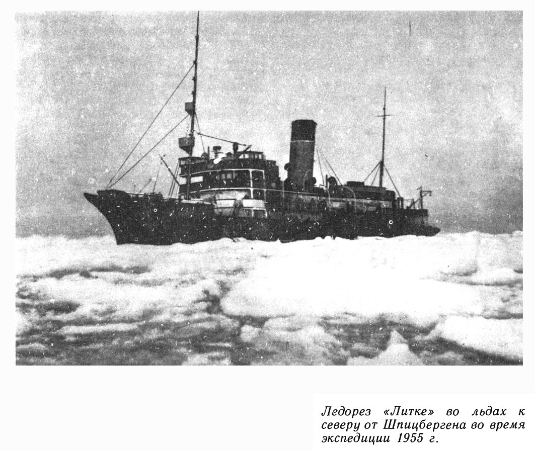 Экспедиция вышла на ледорезе «Литке» из Мурманска 24 августа 1955 г. Выполнив попутное задание руководства Главсевморпути (проводку транспорта из Белого моря на Диксон), ледорез 8 сентября направился, в район работ-на север от Земли Франца-Иосифа. Здесь удалось, впервые обогнув со стороны Карского моря Землю Франца-Иосифа, выполнить океанографическую съемку в пределах акватории, значительная часть которой ранее никогда не посещалась исследовательскими судами в свободном плавании, т.е. в плавании в сплоченных льдах. Во время работ в этом районе была достигнута рекордная широта свободного плавания — 83°21' с. ш. на меридиане 53°11' в. д. [ прим.:* Рекорд побил атомоход «Арктика» (ныне «Леонид Брежнев»), когда в августе 1977 г. достиг Северного полюса. ] Плавание проходило в сложных условиях: стояла преимущественно пасмурная погода, часто были весьма плотные туманы. Встречалось большое количество айсбергов и их обломков. Участники экспедиции очень часто видели на льду белых медведей. Звери приближались к ледорезу на 200-300 метров. А иногда, когда выполнялись наблюдения и судно дрейфовало, подходили к нему и охотно лакомились кусками хлеба, которые им бросали с борта. Вспоминаются случаи, когда подходили одновременно 3-5 медведей. Услышав гудок, медведи разбегались.