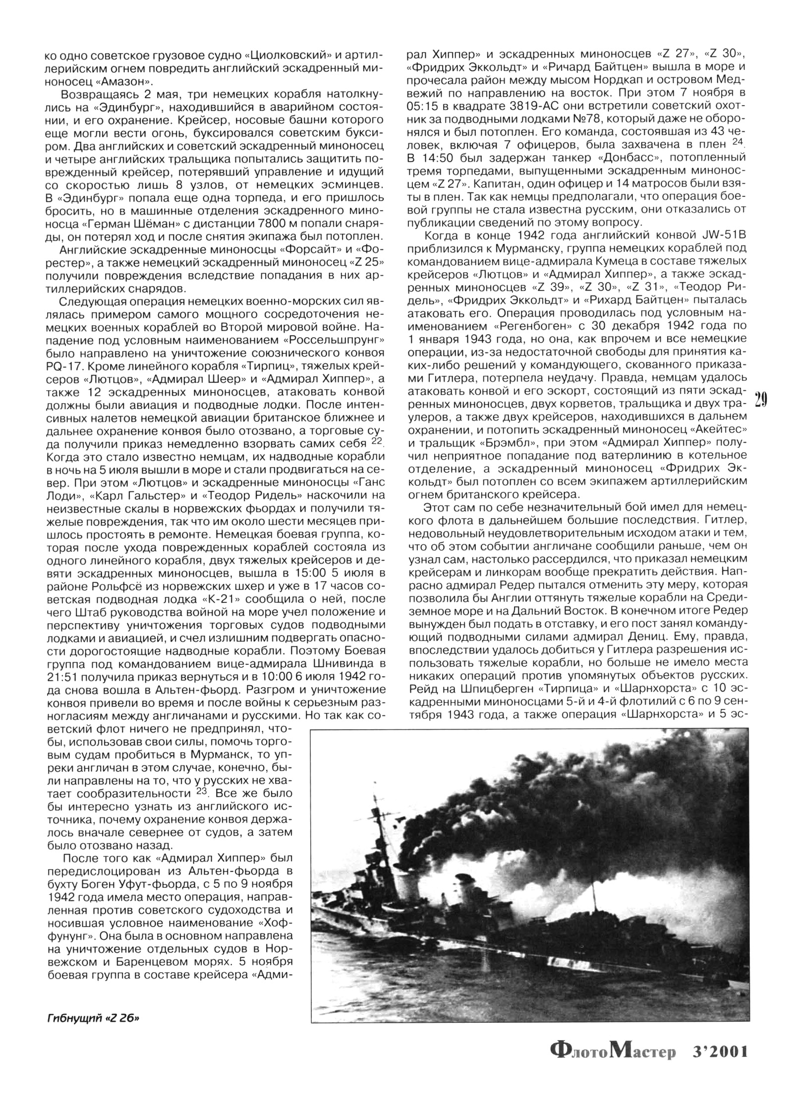 Другая атака имела место 29 марта 1942 года, когда эскадренные миноносцы «Z 26», «Z 24» и «Z 25» напали на конвой союзников, шедший в Мурманск, при этом британский крейсер «Тринидад» и эскадренный миноносец «Эклипс» получили повреждения, а один танкер был потоплен. Во время этого боя огнем британских корабельных орудий был потоплен эскадренный миноносец «Z 26»