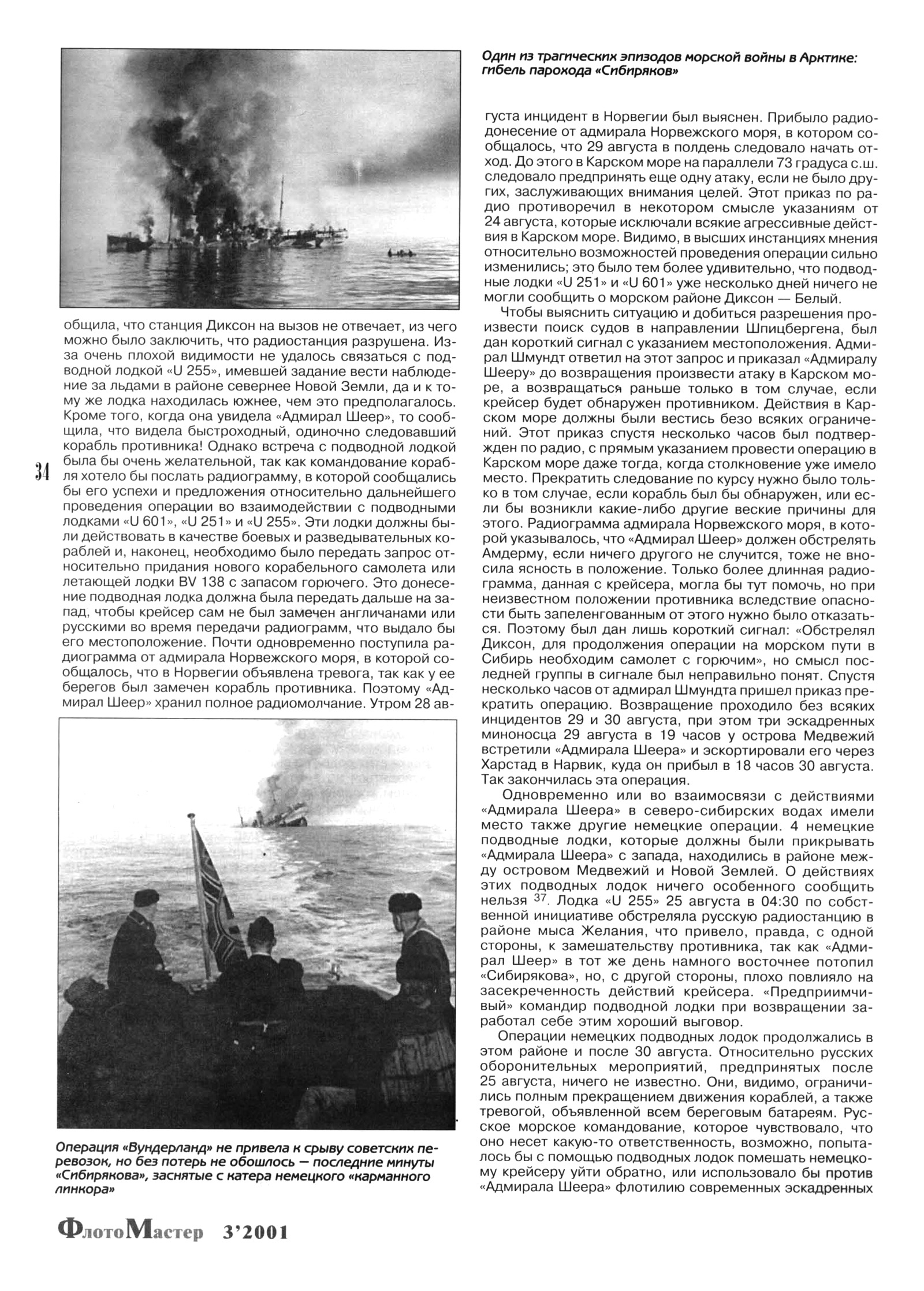 {31 Согласно отечественным источникам радиограмма была следующей: «Вижу неизвестный вспомогательный крейсер, который запрашивает обстановку». Не исключено, что ее вторая часть, как и приводимая Майстером концовка («...пожалуйста, наблюдайте за нами») являлись составными частями одного и того же сообщения, но и радиостанция Диксона и связисты «Шеера» приняли его не целиком.}. «Сибиряков» немедленно повернул к берегу острова Белуха, расположенного приблизительно на расстоянии 10 миль, и очень удачно замаскировался с помощью дымовых шашек, одновременно открыв огонь по немецкому крейсеру из всех орудий. «Адмиралу Шееру» удалось вторым залпом попасть в цель. Всего было произведено шесть залпов из 280-мм орудий, из них половину — обеими башнями. В советский ледокол попало, видимо, четыре снаряда, и он после некоторого маневрирования потерял ход. «Адмирал Шеер» в 12:45 прекратил огонь и приблизился к нему, приблизительно, на 4000 м, а «Сибиряков» продолжал стрелять, охваченный пламенем, но не добился попаданий. И наконец, в 13:15 русское судно затонуло на ровном киле; «Адмирал Шеер» спустил шлюпку, которая спасла 21 человека, среди которых были инженер и метеоролог. Другие русские побоялись сесть в шлюпку