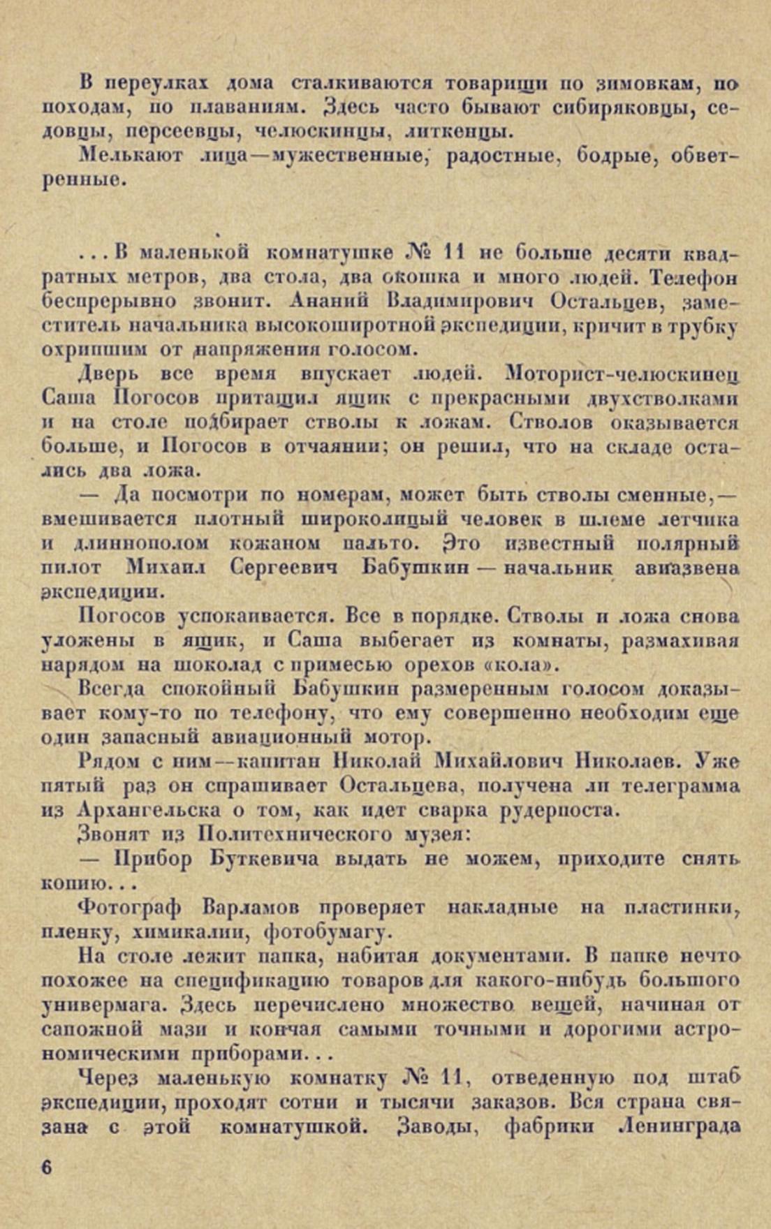 В соседней комнате, рядом с. нами, работает О. Ю. Шмидт. It нашу комнату очень часто заходит начальник экспедиции Георгий Алексеевич Ушаков. Вот сидит Н. Н. Зубов. Сколько тысяч миль проплыли и прошли эти люди, сколько открытии сделали они, и никто из них не разорился. Бэрд, вероятно, немало был удивлен, узнав, что в СССР научные экспедиции снаряжаются и финансируются государством и общественными организациями. Сколько творческих сил и энергии экономит наша страна, избавляющая советских исследователей от необходимости «доставать» деньги. Советский ученый и путешественник свои силы и свое время посвящает целиком научным работам.