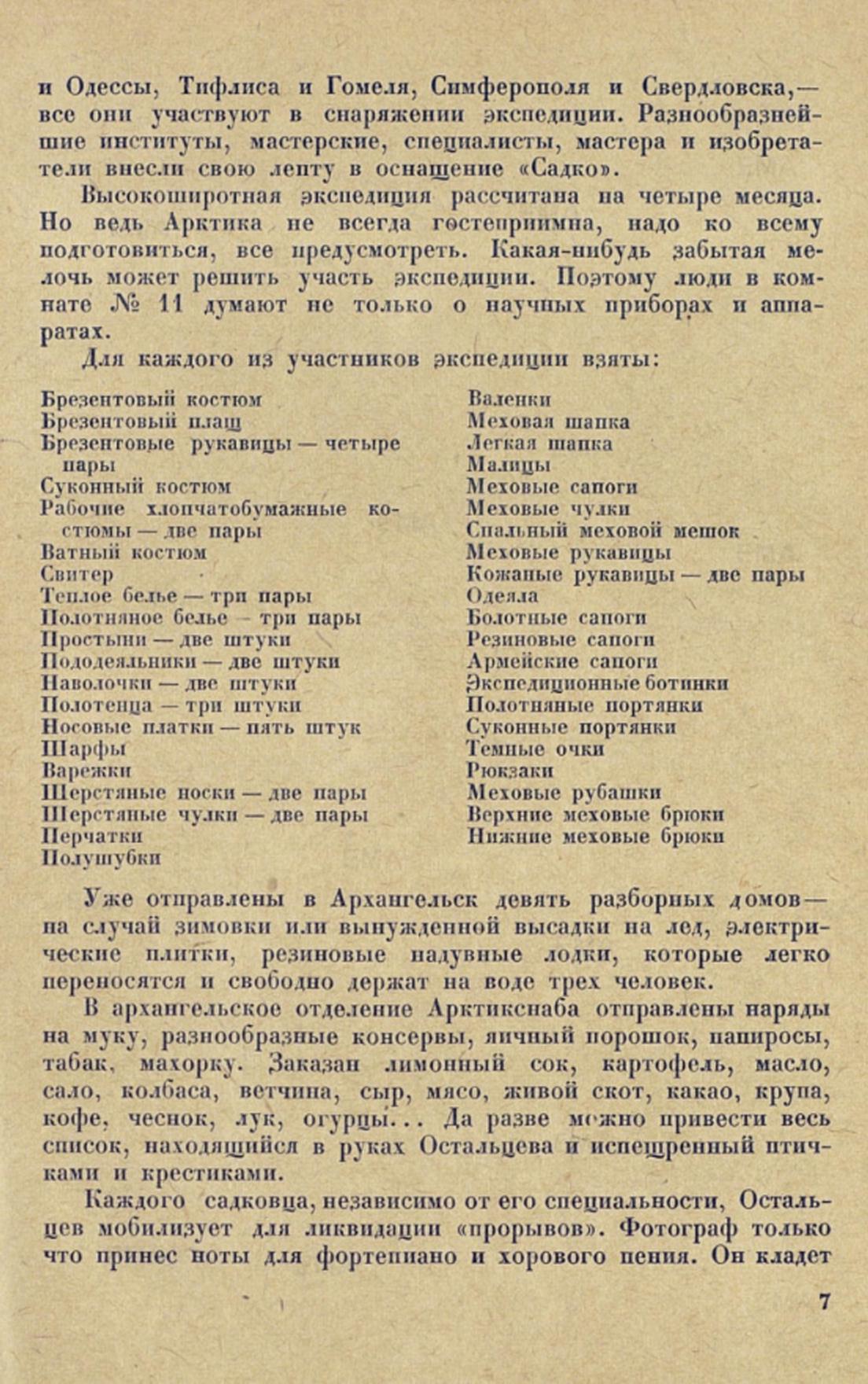 и Одессы, Тифлиса и Гомеля, Симферополя и Свердловска,— все они участвуют в снаряжении экспедиции. Разнообразнейшие институты, мастерские, специалисты, мастера и изобретатели внесли свою ленту в оснащение «Садко».