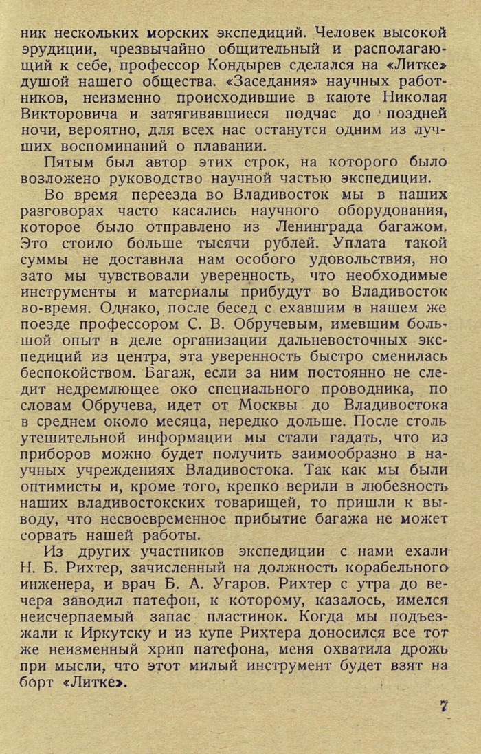 Из других участников экспедиции с нами ехали Н. Б. Рихтер, зачисленный на должность корабельного инженера, и врач Б. А. Угаров. Рихтер с утра до вечера заводил патефон, к которому, казалось, имелся неисчерпаемый запас пластинок. Когда мы подъезжали к Иркутску и из купе Рихтера доносился все тот же неизменный хрип патефона, меня охватила дрожь при мысли, что этот милый инструмент будет взят на борт «Литке».