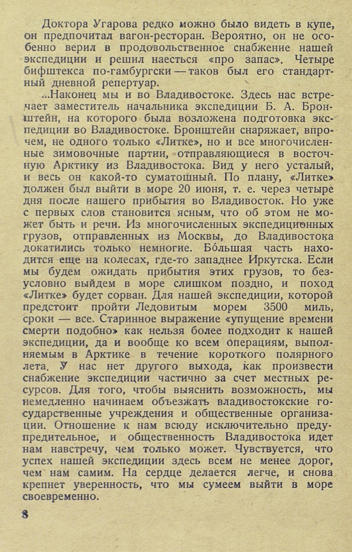 ...Наконец мы и во Владивостоке. Здесь нас встречает заместитель начальника экспедиции Б. А. Бронштейн, на которого была возложена подготовка экспедиции во Владивостоке. Бронштейн снаряжает, впрочем, не одного только «Литке», но и все многочисленные зимовочные партии, отправляющиеся в восточную Арктику из Владивостока. Вид у него усталый, и весь он какой-то суматошный. По плану, «Литке» должен был выйти в море 20 июня, т. е. через четыре дня после нашего прибытия во Владивосток. Но уже с первых слов становится ясным, что об этом не может быть и речи. Из многочисленных экспедиционных грузов, отправленных из Москвы, до Владивостока докатились только немногие. Большая часть находится еще на колесах, где-то западнее Иркутска. Если мы будем ожидать прибытия этих грузов, то безусловно выйдем в море слишком поздно, и поход «Литке» будет сорван. Для нашей экспедиции, которой предстоит пройти Ледовитым морем 3500 миль, сроки — все. Старинное выражение «упущение времени смерти подобно» как нельзя более подходит к нашей экспедиции, да и вообще ко всем операциям, выполняемым в Арктике в течение короткого полярного лета. У нас нет другого выхода, как произвести снабжение экспедиции частично за счет местных ресурсов. Для того, чтобы выяснить возможность, мы немедленно начинаем объезжать владивостокские государственные учреждения и общественные организации. Отношение к нам всюду исключительно предупредительное, и общественность Владивостока идет нам навстречу, чем только может. Чувствуется, что успех нашей экспедиции здесь всем не менее дорог, чем нам самим. На сердце делается легче, и снова крепнет уверенность, что мы сумеем выйти в море своевременно.