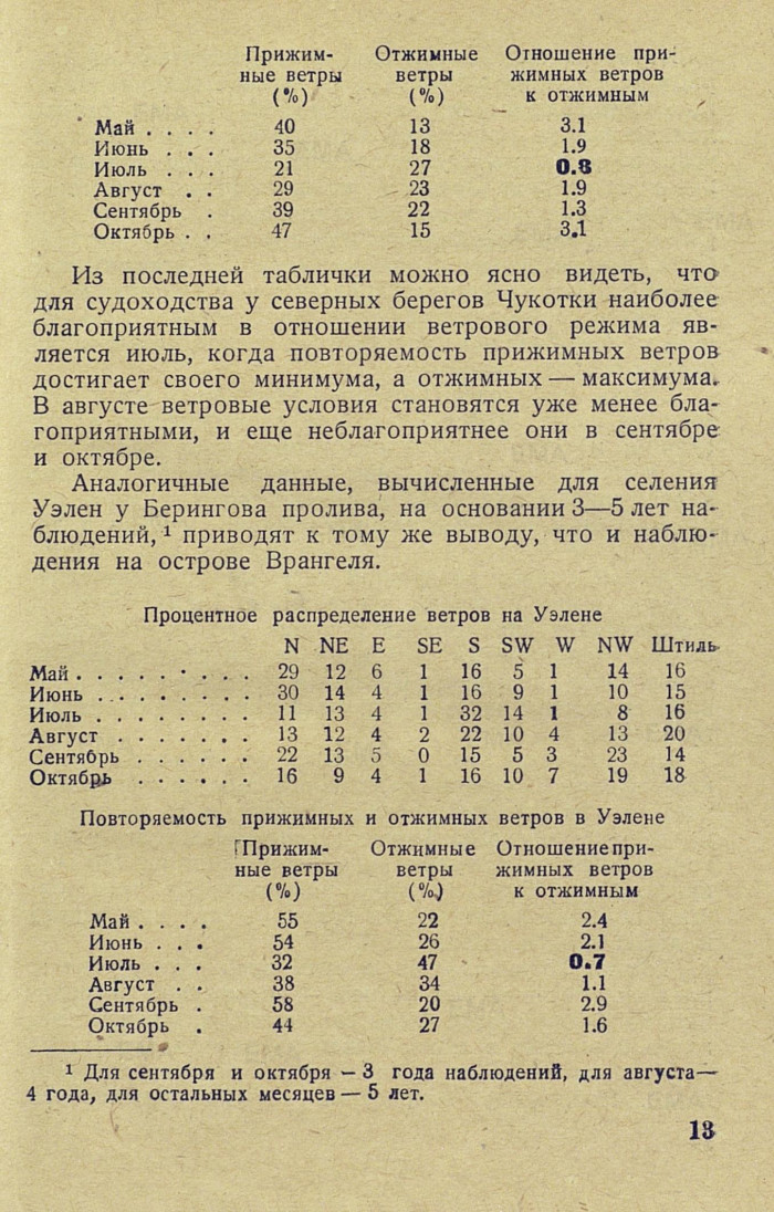 Для Чукотского побережья, вдоль которого по преимуществу происходят плавания между Беринговым проливом и Колымой, прижимными ветрами, т. е. ветрами, пригоняющими лед к берегу, являются ветры с NW, N и NE, а отжимными — ветры с SE, S и SW. {1} Если мы для острова Врангеля вычислим повторяемость ветров для этих двух групп, то будем иметь: