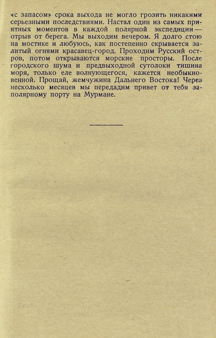 «с запасом» срока выхода не могло грозить никакими серьезными последствиями. Настал один из самых приятных моментов в каждой полярной экспедиции — отрыв от берега. Мы выходим вечером. Я долго стою на мостике и любуюсь, как постепенно скрывается залитый огнями красавец-город. Проходим Русский остров, потом открываются морские просторы. После городского шума и предвыходной сутолоки тишина моря, только еле волнующегося, кажется необыкновенной. Прощай, жемчужина Дальнего Востока! Через несколько месяцев мы передадим привет от тебя заполярному порту на Мурмане.