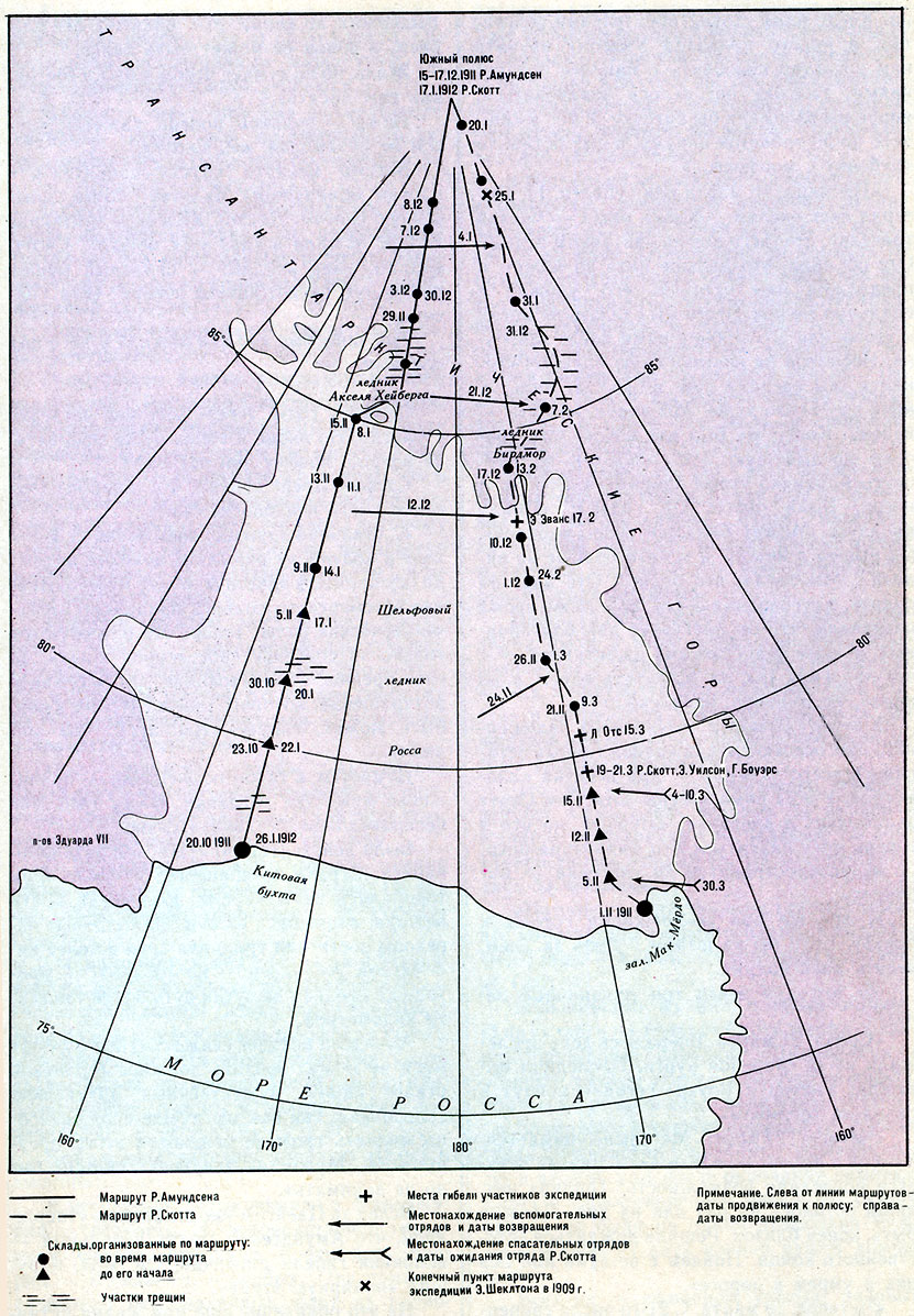 Амундсен, как известно, устроил свою базу в сотнях километров от базы Скотта. Он шел своим, неизведанным маршрутом, их пути пересеклись только у полюса.