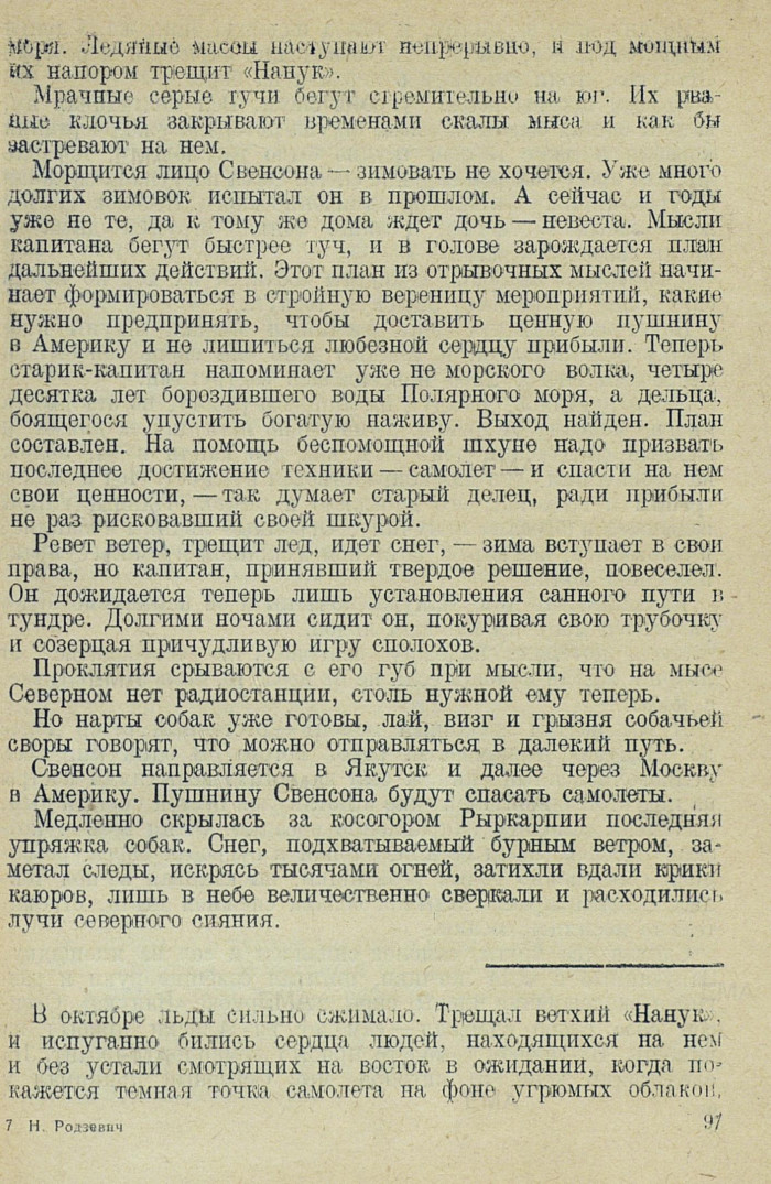 Морщится лицо Свенсона — зимовать не хочется. Уже много долгих зимовок испытал он в прошлом. А сейчас и годы уже но те, да к тому же дома ждет дочь — невеста. Мысли капитана бегут быстрее туч, и в голове зарождается план дальнейших действий. Этот план из отрывочных мыслей начинает формироваться в стройную вереницу мероприятий, какие нужно предпринять, чтобы доставить ценную пушнину в Америку и не лишиться любезной сердцу прибыли. Теперь старик-капитан напоминает уже не морского волка, четыре десятка лет бороздившего воды Полярного моря, а дельца, боящегося упустить богатую наживу. Выход найден. План составлен. На помощь беспомощной шхуне надо призвать последнее достижение техники — самолет — и спасти на нем свои ценности, — так думает старый делец, ради прибыли не раз рисковавший своей шкурой.