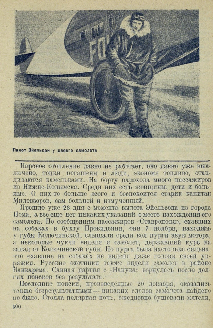 Прошло уже 23 дня с момента вылета Эйельсона из города Нома, а все еще нет никаких указаний о месте нахождения его самолета. По сообщениям пассажиров «Ставрополя», ехавших на собаках в бухту Провидения, они 7 ноября, находясь у губы Колючинской, слышали среди воя пурги звук мотора, а некоторые чукчи видели и самолет, державший курс на запад от Колючинской губы. Но пурга была настолько сильна, что ехавшие на собаках не видели даже головы своей упряжки. Русские охотники также видели самолет в районе Ванкарема. Санная партия с «Нанука» вернулась после долгих поисков без результата.