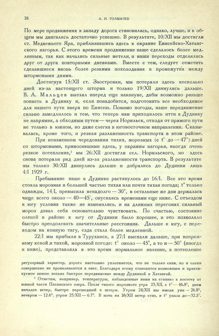 При неизменном чередовании тихих, морозных (с t° до —- 47°) дней со штормовыми, приносившими здесь, у окраины нагорья, иногда очень резкое потепление, {1} мы 26/ХII достигли сел. Норильского, но здесь снова потеряли ряд дней из-за разлаженности транспорта. В результате мы только 30/ХII двинулись дальше и добрались до Дудинки лишь 4/I 1929 г.