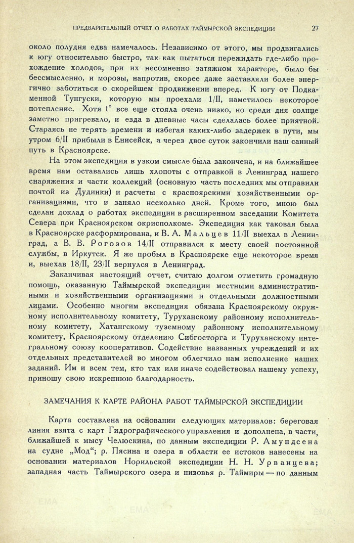 ЗАМЕЧАНИЯ К КАРТЕ РАЙОНА РАБОТ ТАЙМЫРСКОЙ ЭКСПЕДИЦИИКарта составлена на основании следующих материалов: береговая линия взята с карт Гидрографического управления и дополнена, в части, ближайшей к мысу Челюскина, по данным экспедиции Р. Амундсена на судне „Мод“; р. Пясина и озера в области ее истоков нанесены на основании материалов Норильской экспедиции Н. Н. Урванцева; западная часть Таймырского озера и низовья р. Таймиры — по данным