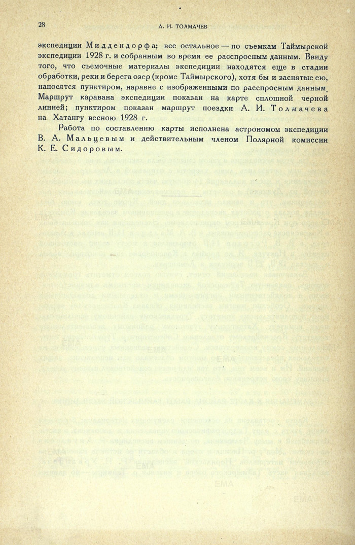 экспедиции Миддендорфа; все остальное — по съемкам Таймырской экспедиции 1928 г. и собранным во время ее расспросным данным. Ввиду того, что съемочные материалы экспедиции находятся еще в стадии обработки, реки и берега озер (кроме Таймырского), хотя бы и заснятые ею, наносятся пунктиром, наравне с изображенными по расспросным данным. Маршрут каравана экспедиции показан на карте сплошной черной линией; пунктиром показан маршрут поездки А. И. Толмачева на Хатангу весною 1928 г.