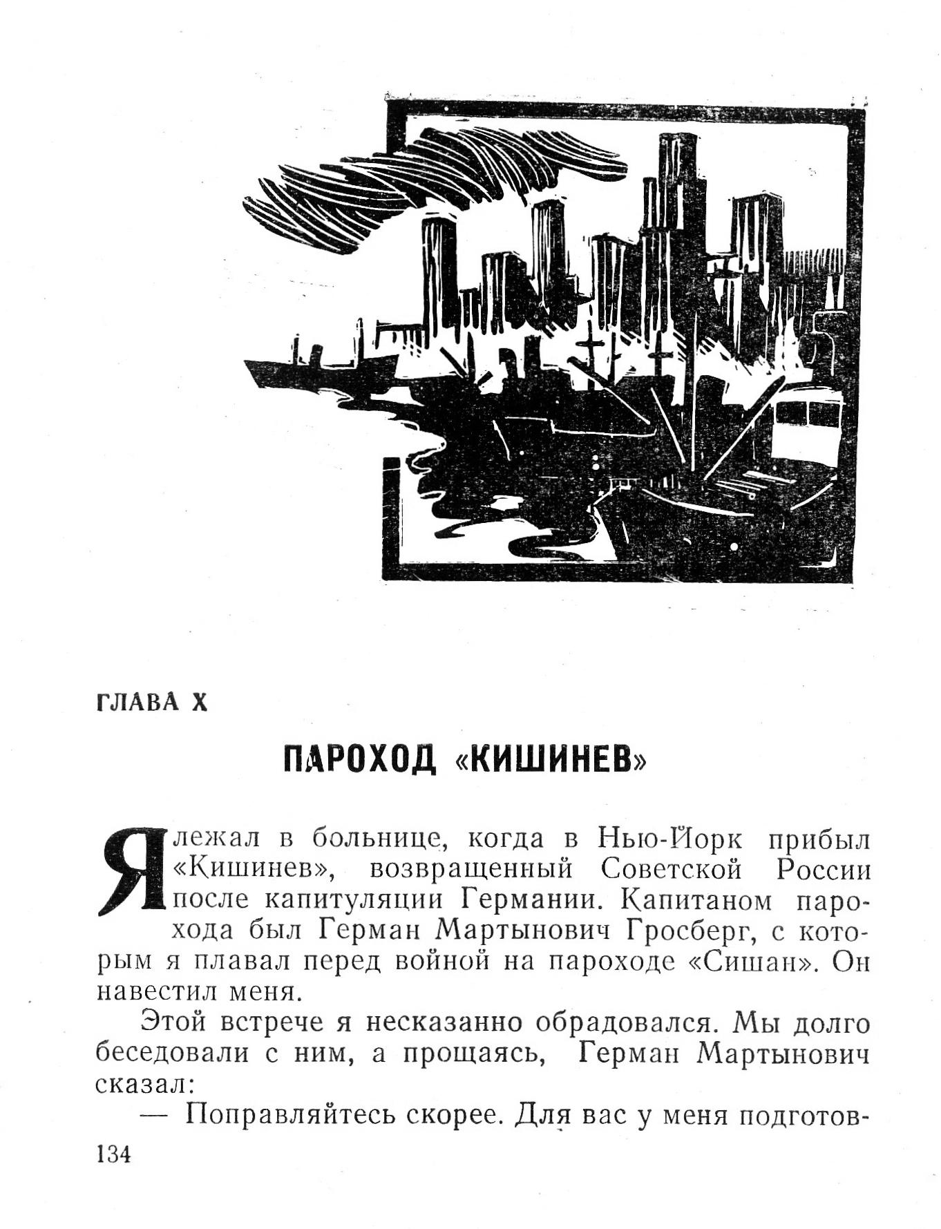 ГЛАВА XПАРОХОД «КИШИНЕВ»Я лежал в больнице, когда в Нью-Йорк прибыл «Кишинев», возвращенный Советской России после капитуляции Германии. Капитаном парохода был Герман Мартынович Гросберг, с которым я плавал перед войной на пароходе «Сишан». Он навестил меня.