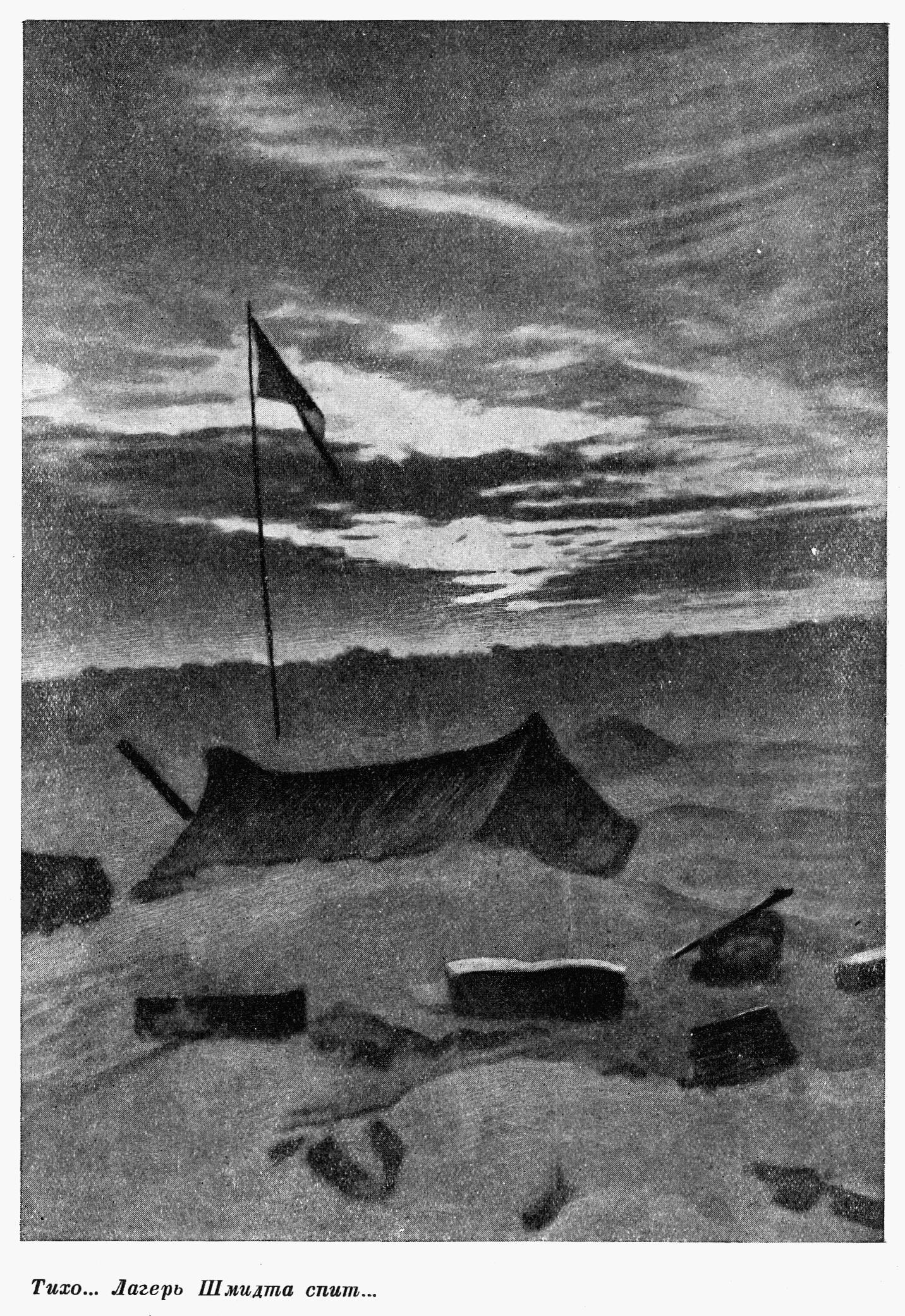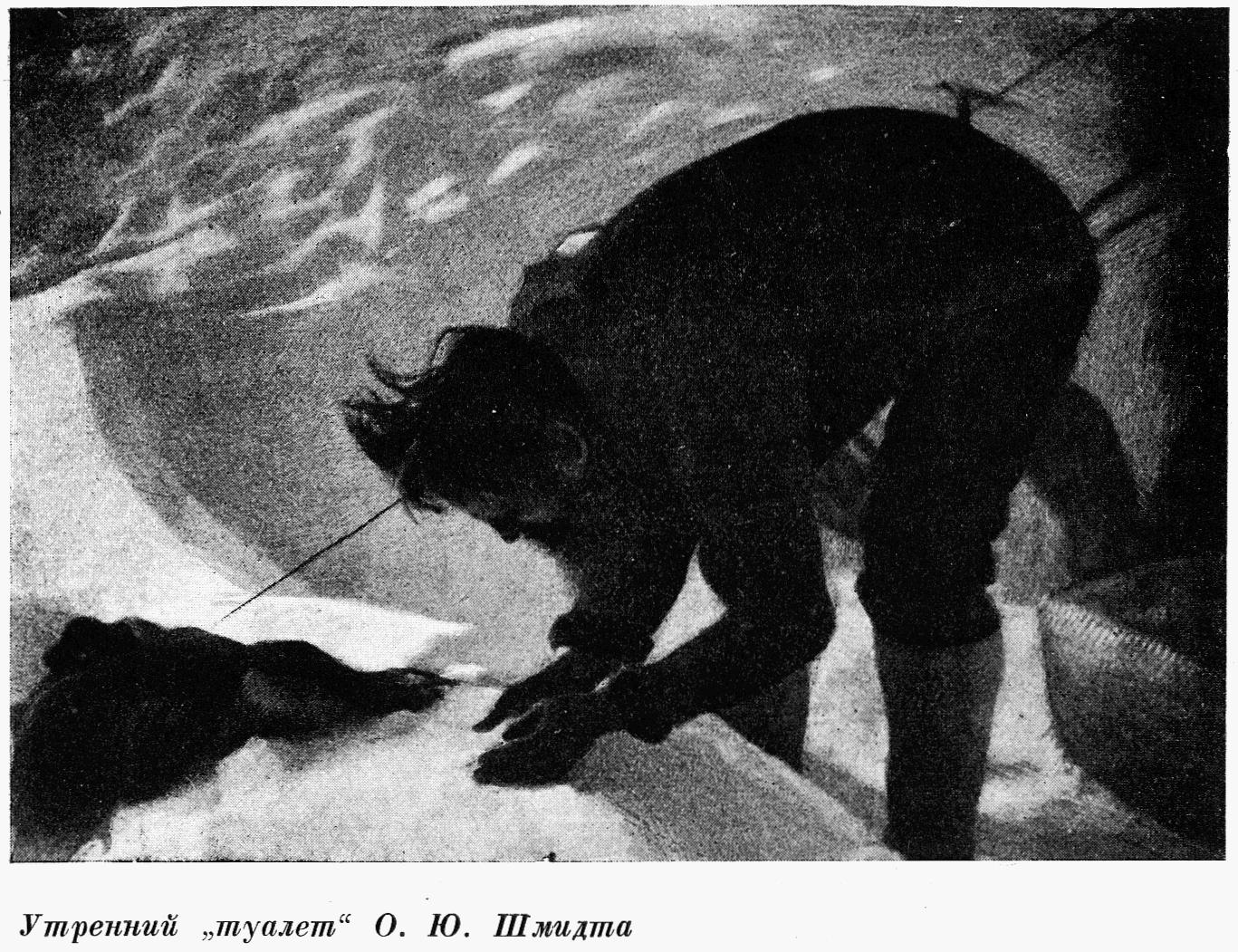 Утром лагерь еще со всех сторон объят тьмой. Так было в первые недели нашего пребывания на льдине. Тьма эта не черная, а чуть белесая. Невеселая картина встречает челюскинца, вышедшего в февральское полярное утро из своей палатки, чтобы помыться после ночи, проведенной в спальном мешке. Великая тишина, пустота, безлюдье... Каково: утреннее умывание под звездами, на 30-градусном морозе, на дрейфующей льдине!... Но челюскинцы — оптимисты. Они знают твердо: еще будут долгие полярные дни, будет устойчивое солнце, будут самолеты, твердая земля.