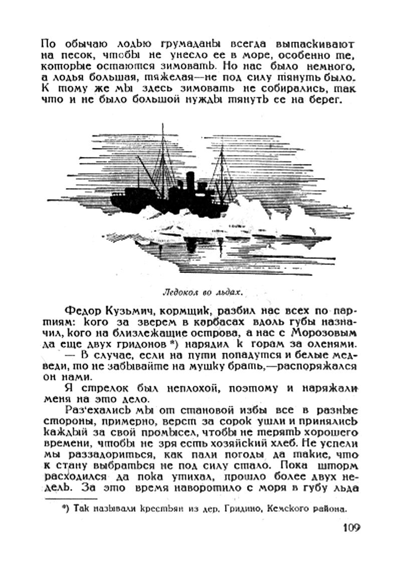Метались мы от хозяина к хозяину, где бы только получить работу да кусок хлеба для семейства. Вдруг слышно стало, уже под весну, что кемский купец Норкин набирает большую команду на зверобой-ный промысел к Груманту. Посоветовался я с батюшкой **) и решил наняться к Норкину в промысел.