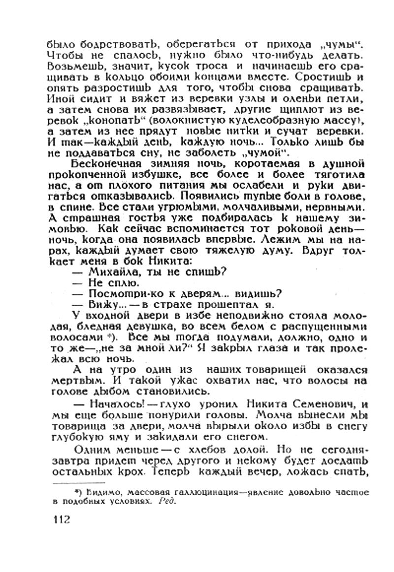 Бесконечная зимняя ночь, коротаемая в душной прокопченной избушке, все более и более тяготила нас, а от плохого питания мы ослабели и руки двигаться отказывались. Появились тупые боли в голове, в спине. Все стали угрюмыми, молчаливыми, нервными. А страшная гостья уже подбиралась к нашему зимовью. Как сейчас вспоминается тот роковой день -ночь. когда она появилась впервые. Лежим мы на нарах, каждый думает свою тяжелую думу. Вдруг толкает меня в бок Никита: