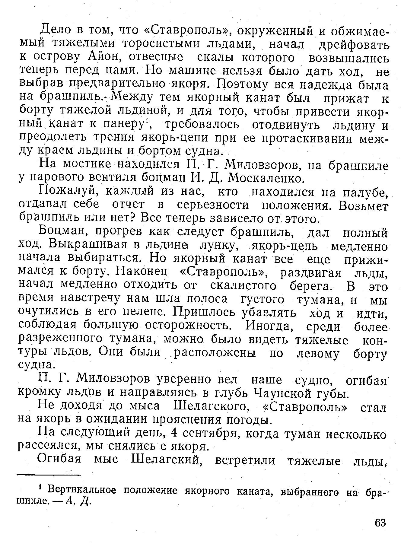 Дело в том, что «Ставрополь», окруженный и обжимаемый тяжелыми торосистыми льдами, начал дрейфовать к острову Айон, отвесные скалы которого возвышались теперь перед нами. Но машине нельзя было дать ход, не выбрав предварительно якоря. Поэтому вся надежда была на брашпиль. Между тем якорный канат был прижат к борту тяжелой льдиной, и для того, чтобы привести якорный, канат к панеру {1}, требовалось отодвинуть льдину и преодолеть трения якорь-цепи при ее протаскивании между краем льдины и бортом судна.
