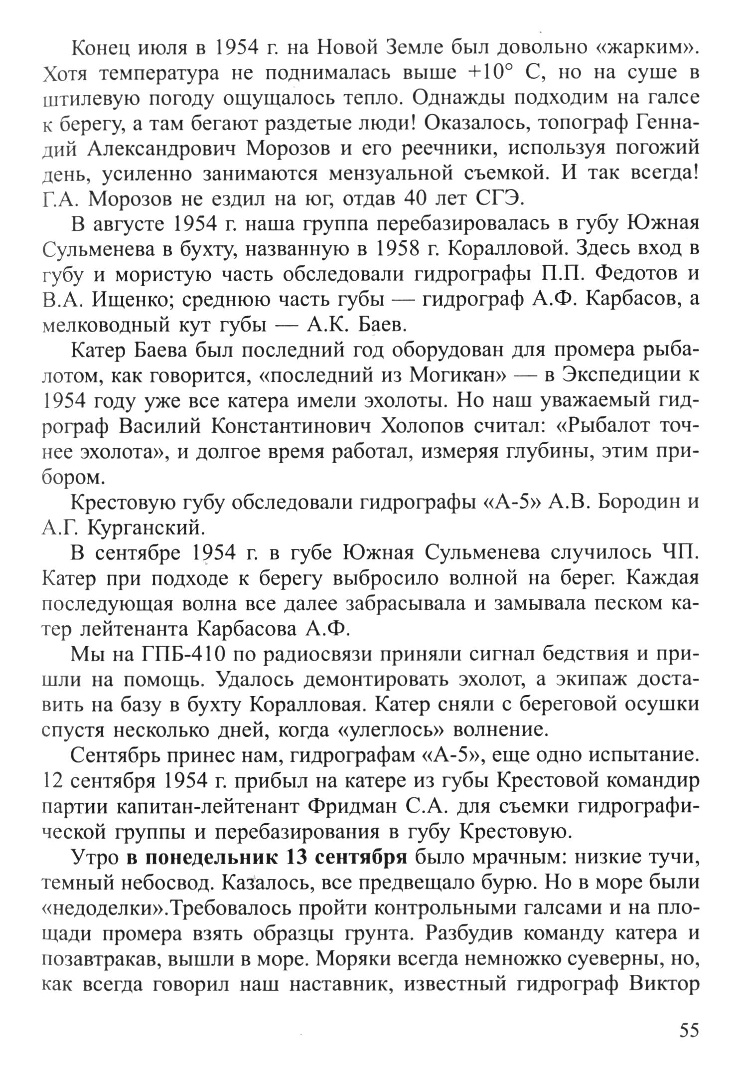 Сентябрь принес нам, гидрографам «А-5», еще одно испытание. 12 сентября 1954 г. прибыл на катере из губы Крестовой командир партии капитан-лейтенант Фридман С. А. для съемки гидрографической группы и перебазирования в губу Крестовую.