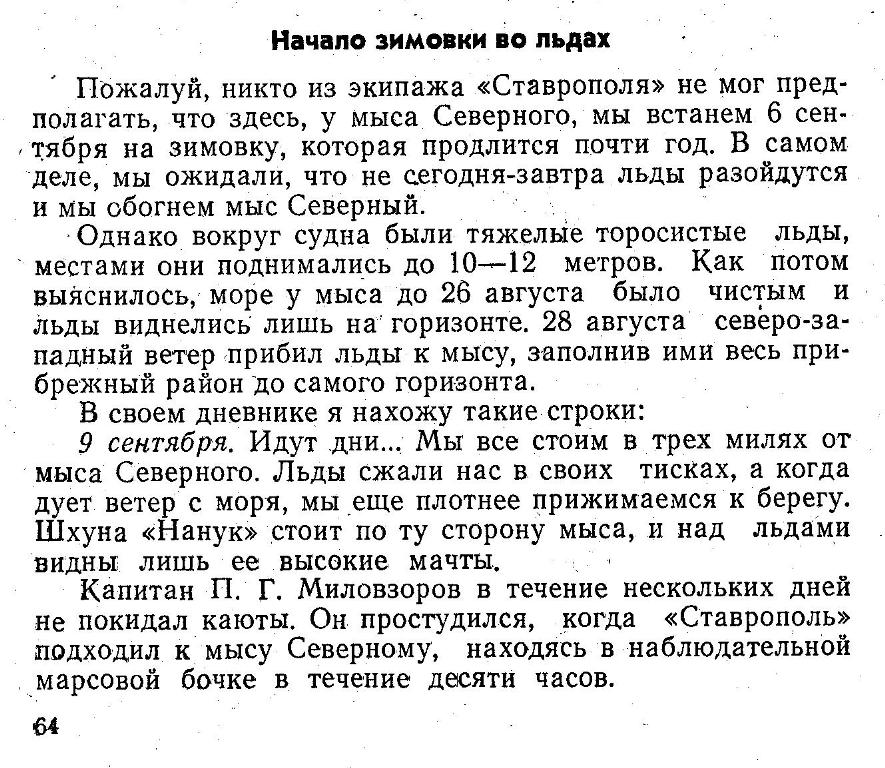 Пожалуй, никто из экипажа «Ставрополя» не мог предполагать, что здесь, у мыса Северного, мы встанем 6 сентября на зимовку, которая продлится почти год. В самом деле, мы ожидали, что не сегодня-завтра льды разойдутся и мы обогнем мыс Северный.