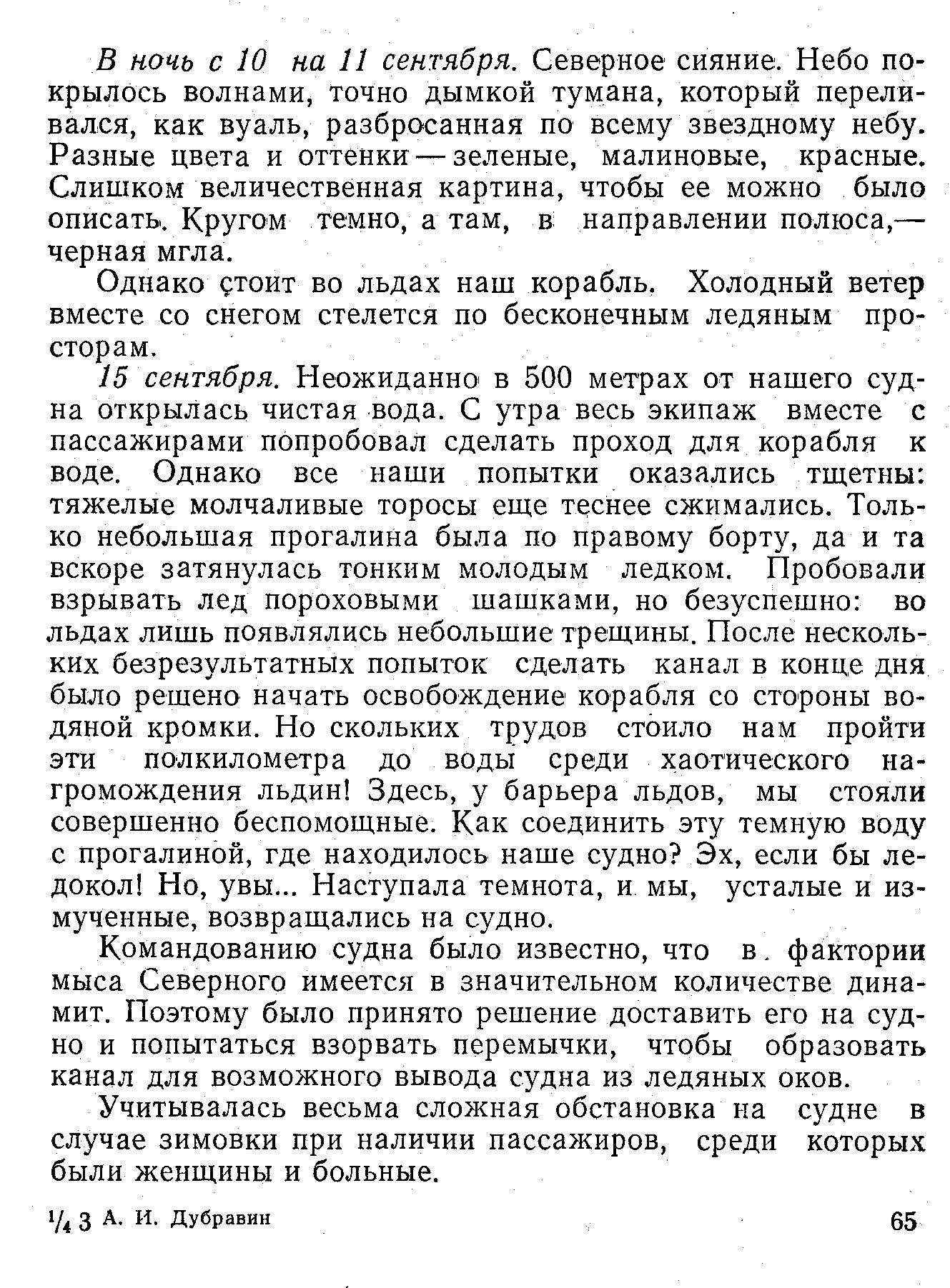 15 сентября. Неожиданно в 500 метрах от нашего судна открылась чистая вода. С утра весь экипаж вместе с пассажирами попробовал сделать проход для корабля к воде. Однако все наши попытки оказались тщетны: тяжелые молчаливые торосы еще теснее сжимались. Только небольшая прогалина была по правому борту, да и та вскоре затянулась тонким молодым ледком. Пробовали взрывать лед пороховыми шашками, но безуспешно: во льдах лишь появлялись небольшие трещины. После нескольких безрезультатных попыток сделать канал в конце дня было решено начать освобождение корабля со стороны водяной кромки. Но скольких трудов стоило нам пройти эти полкилометра до воды среди хаотического нагромождения льдин! Здесь, у барьера льдов, мы стояли совершенно беспомощные. Как соединить эту темную воду с прогалиной, где находилось наше судно? Эх, если бы ледокол! Но, увы... Наступала темнота, и мы, усталые и измученные, возвращались на судно.