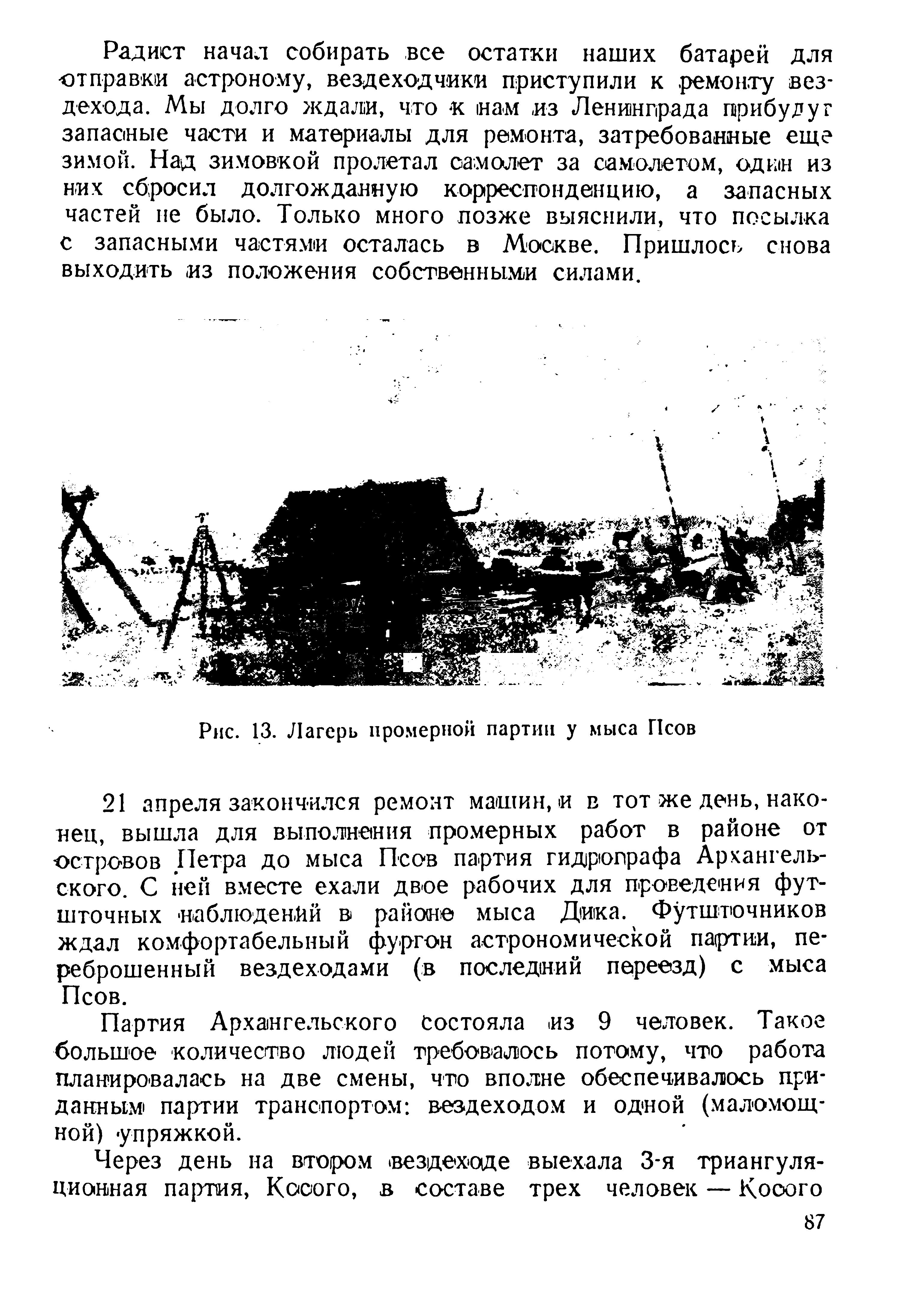 На зимовке в это время оставались только две полевые партии: 2-я промерная Архангельского и триангуляционная — Косого. Выехать на работы ни та, ни другая не могли из-за отсутствия транспорта. Оставалась одна упряжка собак с начинающим каюром из рабочих — Орловым. По своему качеству эта упряжка гадилась только для подсобных работ с небольшим удалением от баз.