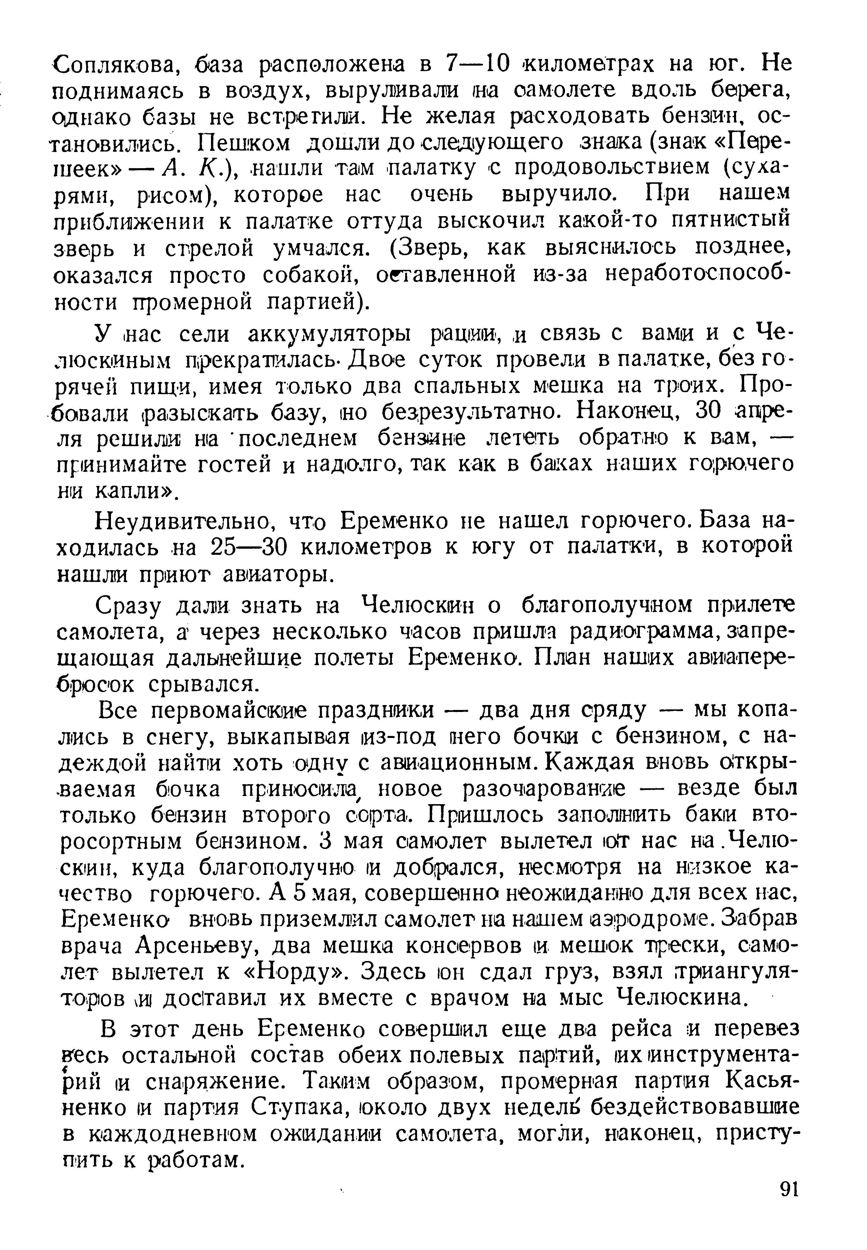 Все первомайские праздники — два дня сряду — мы копались в снегу, выкапывая из-под него бочки с бензином, с надеждой найти хоть одну с авиационным. Каждая вновь открываемая бочка приносила новое разочарование — везде был только бензин второго сорта. Пришлось заполнить баки второсортным бензином. 3 мая самолет вылетел от нас на Челюскин, куда благополучно и добрался, несмотря на низкое качество горючего. А 5 мая, совершенно неожиданно для всех нас, Еременко вновь приземлил самолет на нашем аэродроме. Забрав врача Арсеньеву, два мешка консервов и мешок трески, самолет вылетел к «Норду». Здесь он сдал груз, взял триангуляторов и доставил их вместе с врачом на мыс Челюскина.