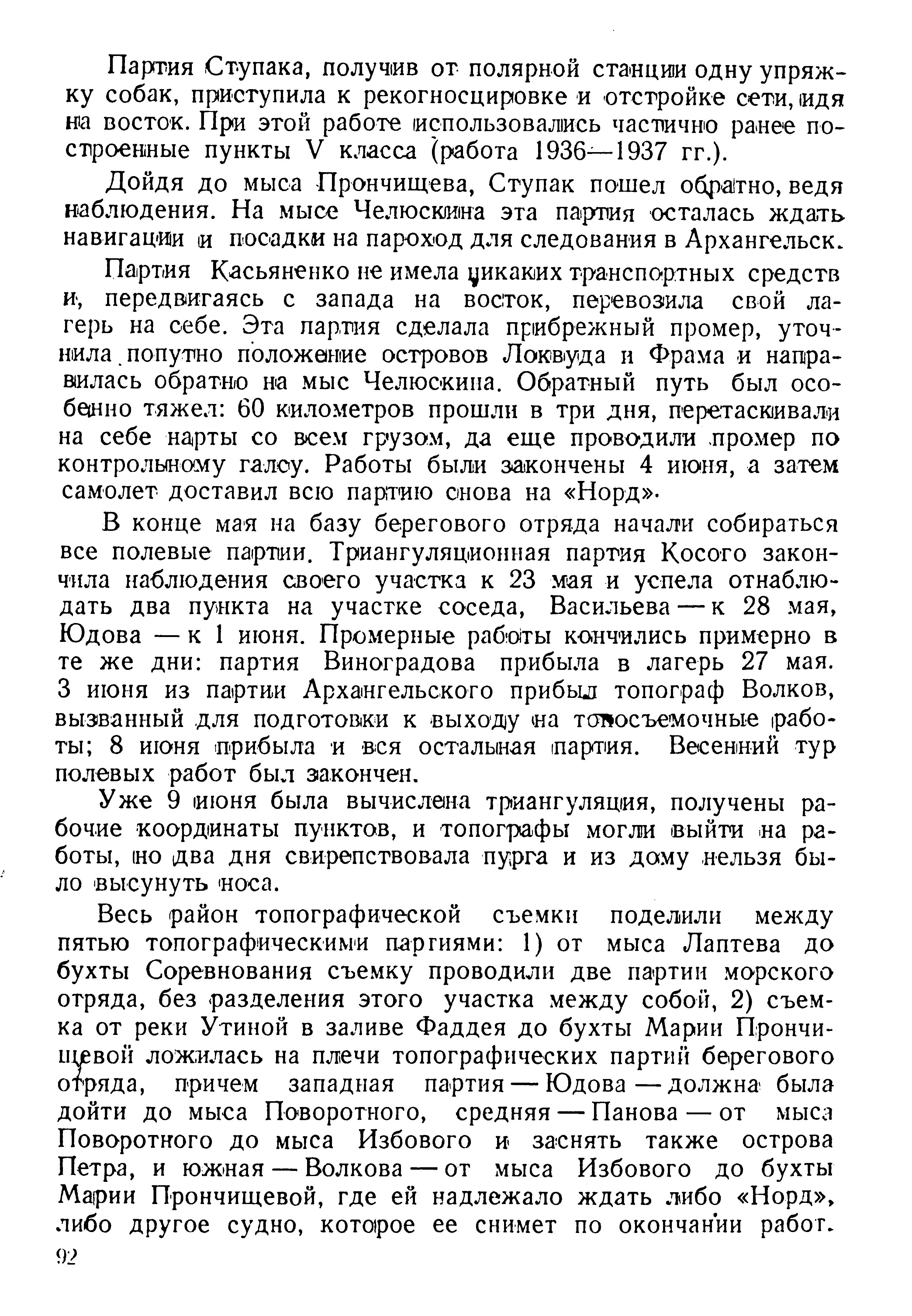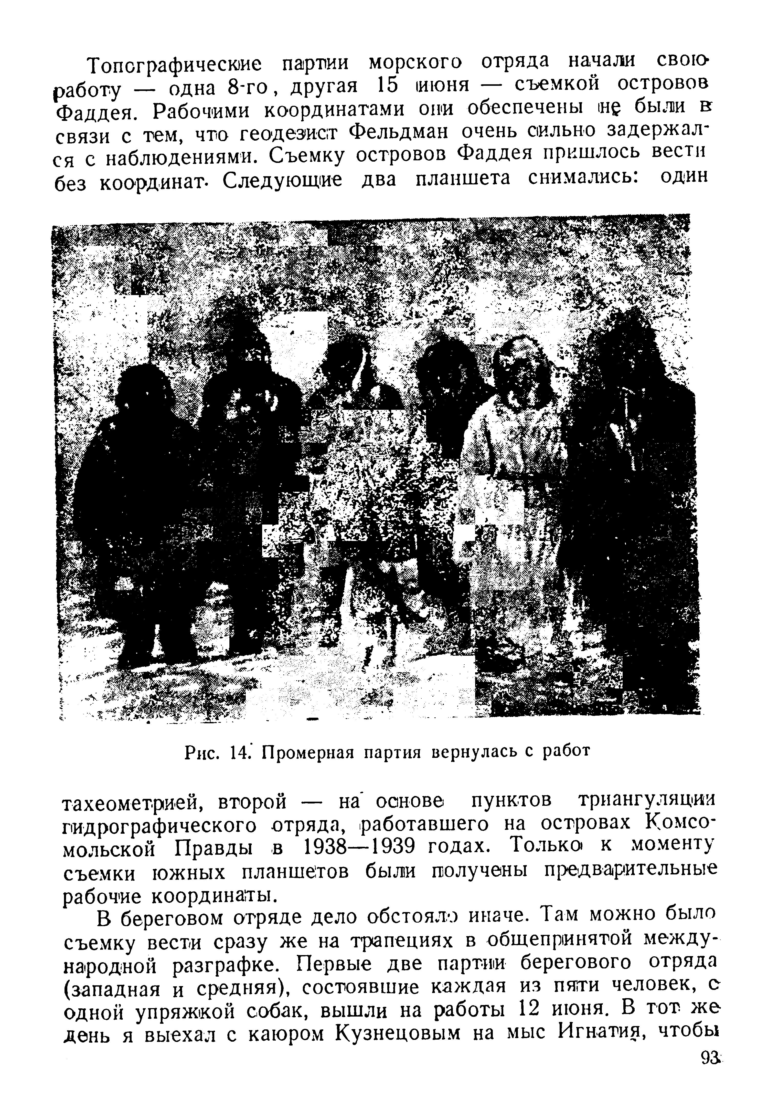 Три триангуляционные и две промерные партии проводили работы в юго-восточной части района;. на северо-западном участке — от залива Фаддея до мыса Челюскина — развертывались работы морского отряда. Для весеннего периода здесь были организованы также две промерные и три триангуляционные партии.
