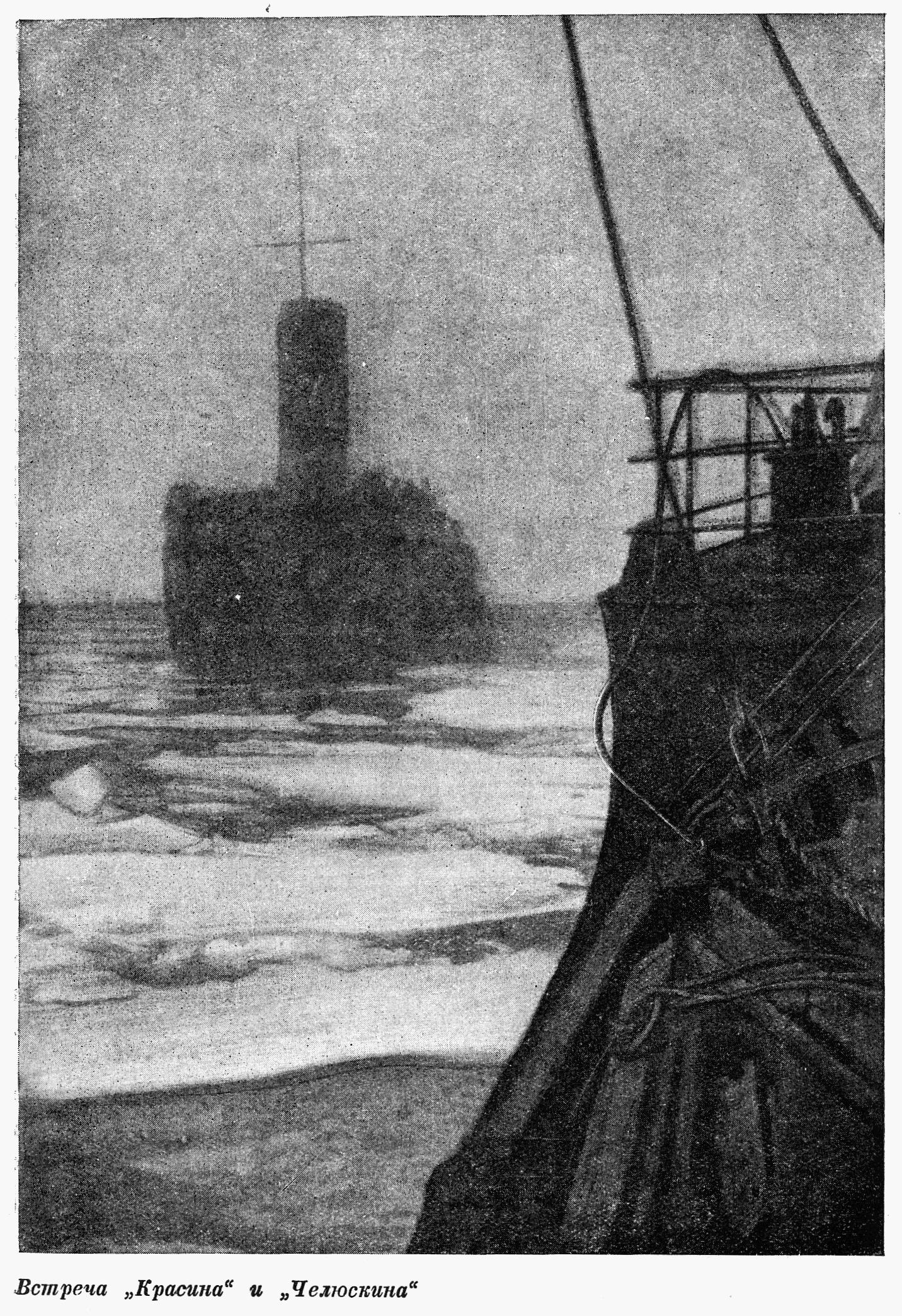 Первого сентября 1933 года в четыре часа дня "Челюскина" встречали не бурные волны Ледовитого океана и не плавающие льдины: его встретили стоявшие на якорях мощные ледоколы и транспортные суда. Первым приветствовал "Челюскина" краснознаменный "Красин", который своими блестящими походами вписал не мало ярких страниц в историю завоевания Арктики; нас приветствовал не раз побывавший в ледовых тисках "Сибиряков", героически прошедший впервые в истории Великий северный морской путь в одну навигацию; нас приветствовал "Седов", неоднократно сопровождавший советские экспедиции. Пароход "Сталин", ледокол "Русанов" по очереди приветствовали нас своими гудками и сиренами, нарушая безмолвную тишину сурового океана и спокойствие его обитателей — морских зверей.